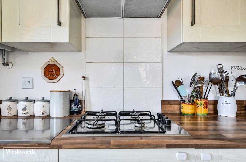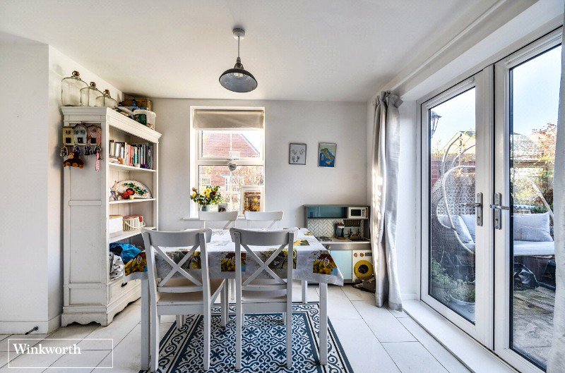 Across the hallway is the kitchen/diner that has been fitted with shaker style units, complemented by wood effect work surfaces and patterned floor tiling. There is an inset gas hob with hood, a built-in oven and grill and plumbing for a dishwasher and washing machine. French doors lead out into the garden.