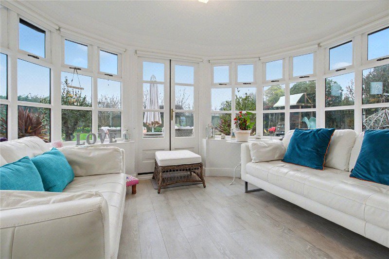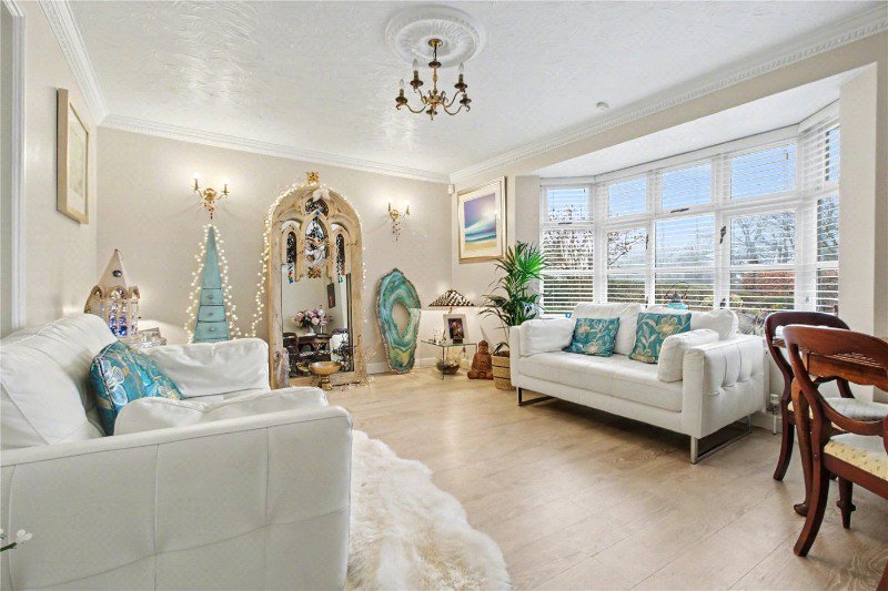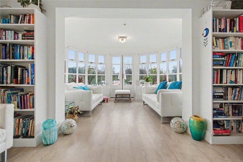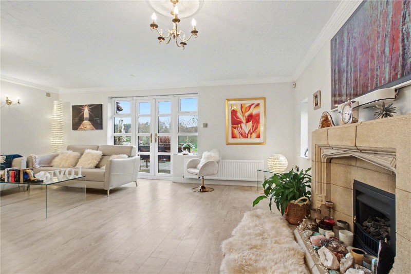 At the rear of the property, the principal reception room provides an elegant yet comfortable setting for everyday living, centred around a handsome stone fireplace and with double doors opening out onto the garden — perfect for extending gatherings outdoors during the warmer months. A further family room to the front offers a versatile additional living space, ideal as a snug, media room or a more informal sitting room.