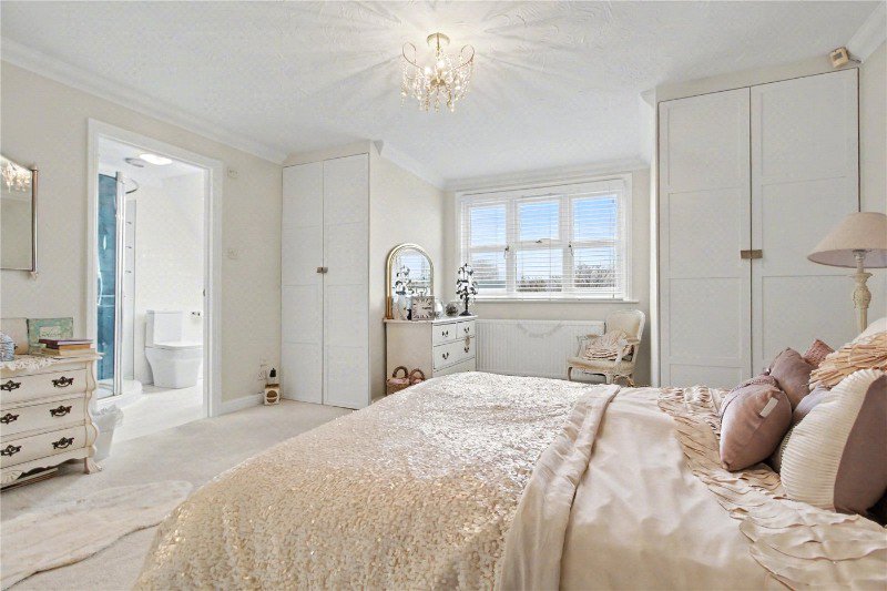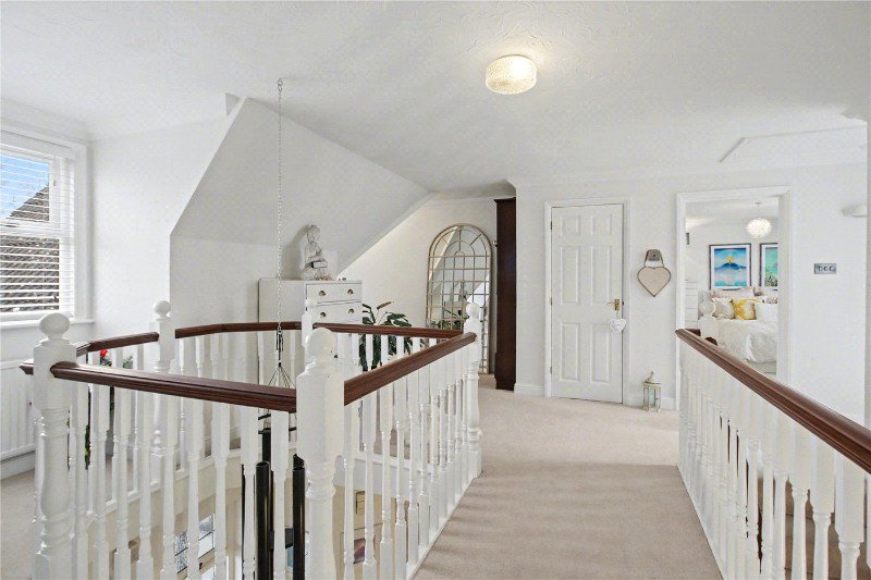 Upstairs, a striking galleried landing enhances the sense of space and architectural design, leading to a collection of impressively proportioned bedrooms. The principal bedroom enjoys the luxury of a generous en-suite shower room, while the guest bedroom also benefits from its own goode-size en-suite facilities. The remaining three bedrooms are served by a well-appointed family bathroom, and a further cloakroom, ensuring the home comfortably accommodates family and guests alike.