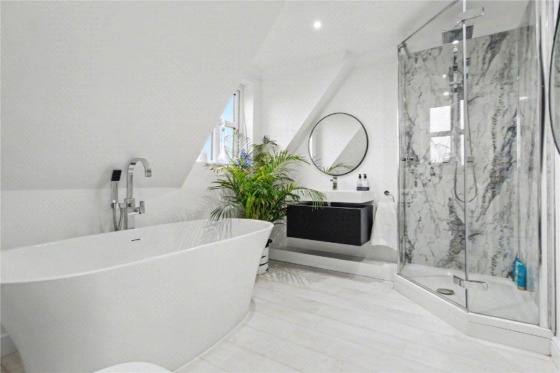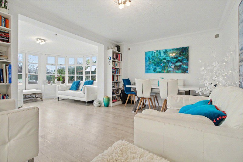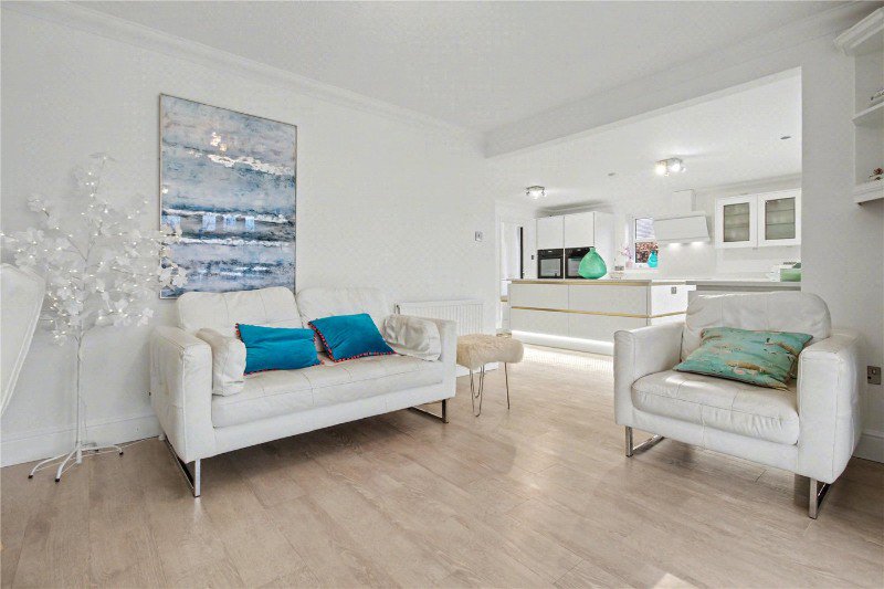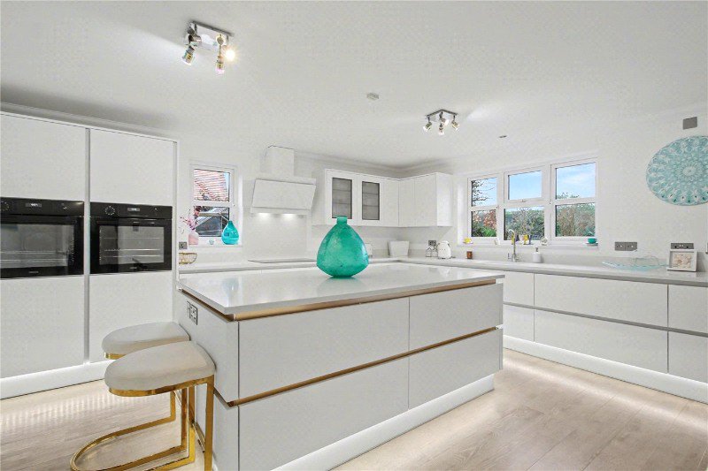 The heart of the home is undoubtedly the impressive kitchen and dining space, designed with entertaining firmly in mind. The kitchen itself is beautifully appointed with sleek contemporary cabinetry, integrated appliances and a substantial island that naturally becomes the hub of the home. From here the space flows seamlessly into the dining area and onwards into the garden room with double doors leading out onto the patio and south-facing rear landscaped private gardens, where views provide a wonderful backdrop for family and larger gatherings alike.