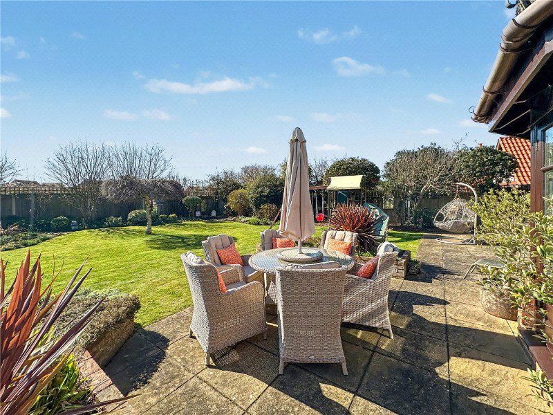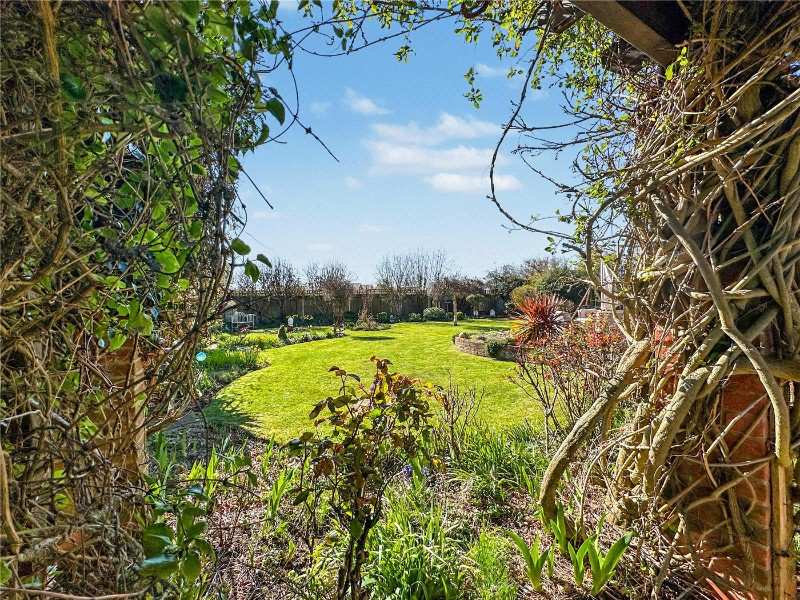Outside, the gardens provide a private and peaceful setting, enclosed and thoughtfully landscaped with attractive borders filled with mature shrubs and perennial planting. A lawned area offers plenty of space for children to play or for relaxed outdoor entertaining, while the sweeping driveway to the front provides extensive parking and access to the double garage, and a beautifully landscaped large front garden.