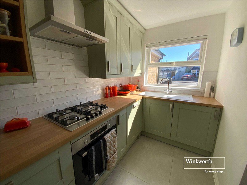 Kitchen has a front aspect window and has been fitted with a range of cupboards and drawers with some integrated appliances.