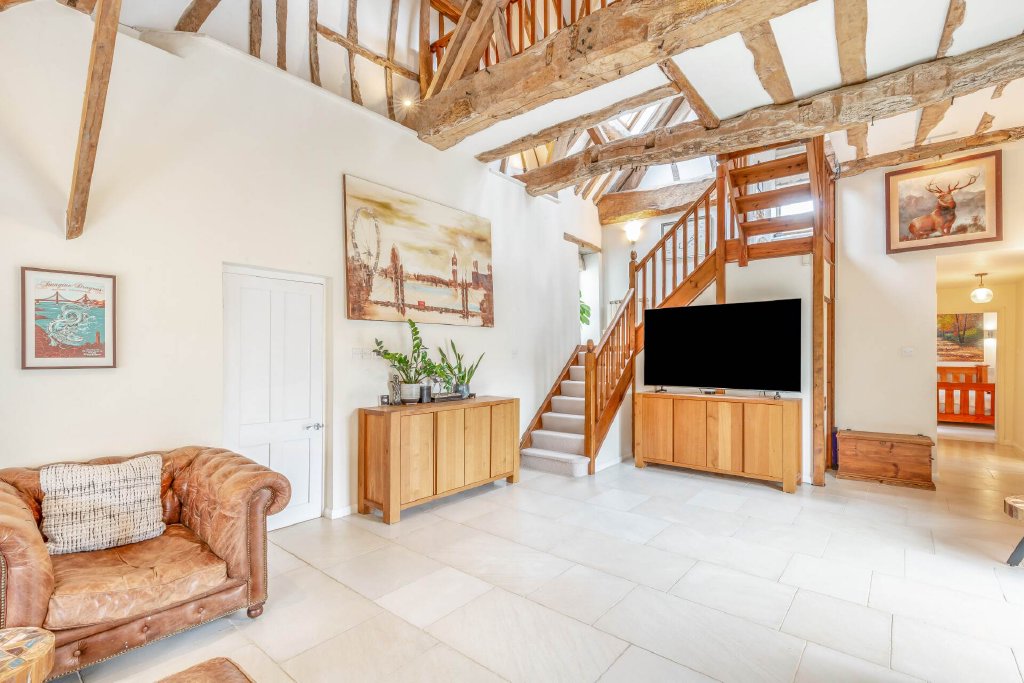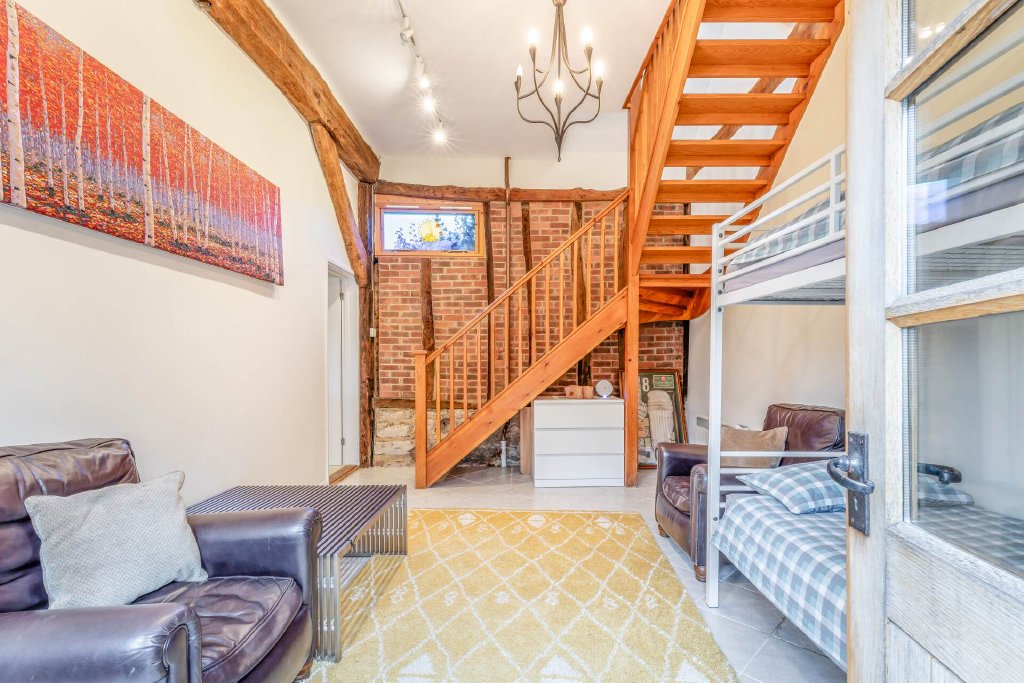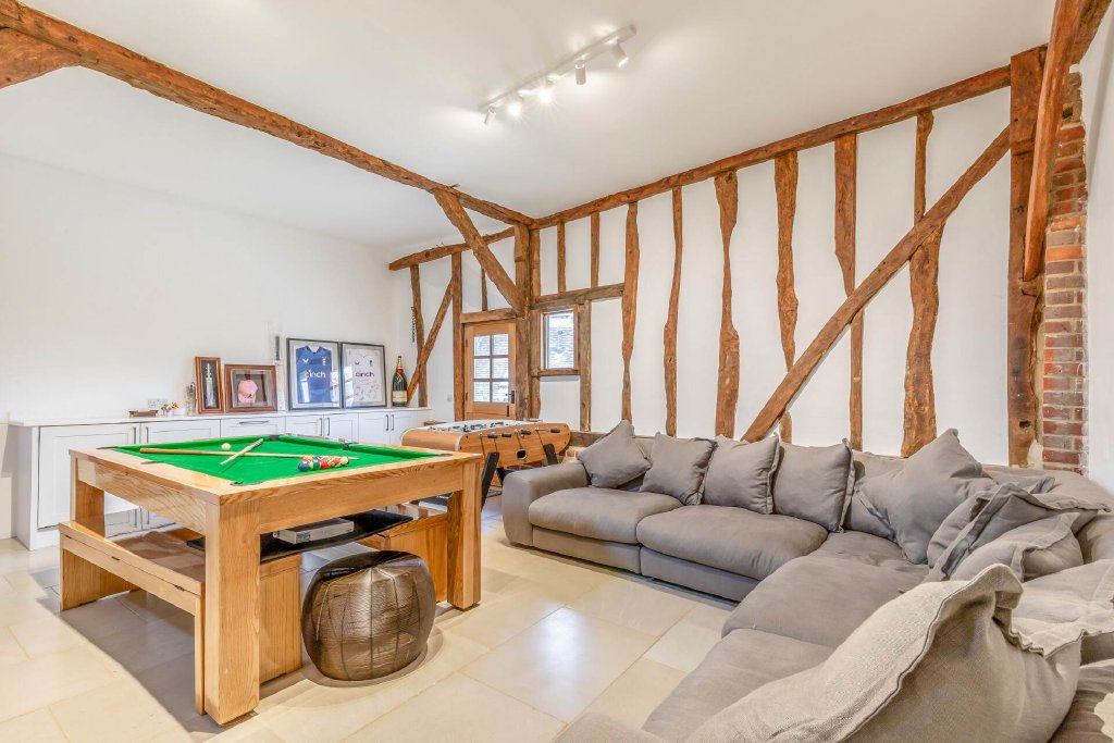 Adjacent to the main property is a wonderful large Annexe on two floors. It includes a large barn/games area with adjacent garage on the ground floor, with a kitchen, open plan living area, bedroom and bathroom, ideal for when guests come to stay.