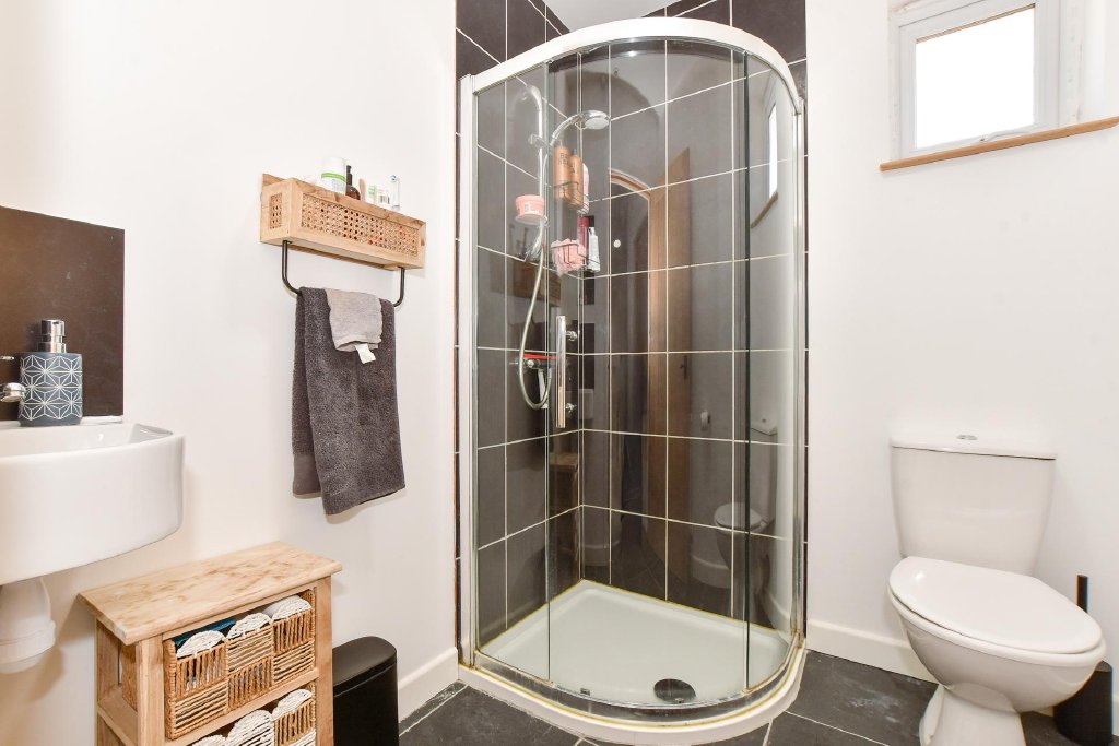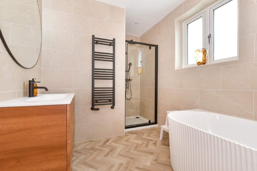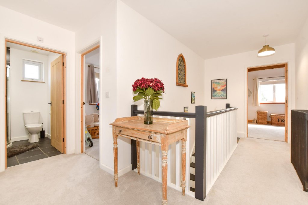 The first floor is arranged around a striking galleried landing, leading to four well‑proportioned double bedrooms. The principal suite is a standout feature, boasting a vaulted ceiling with exposed beams and a luxurious ensuite shower room. This beautifully finished space includes a walk‑in shower enclosure, stylish tiling, and twin sinks. The remaining bedrooms are served by a modern family shower room as well as a stunning main bathroom, complete with a freestanding bathtub and a large walk‑in shower, ideal for busy households.