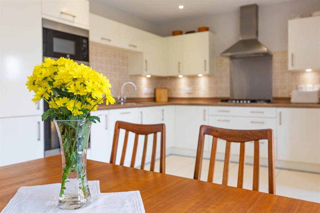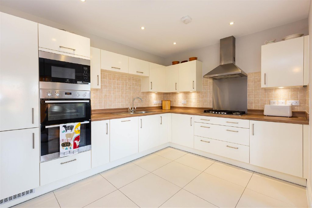 Fitted with a generous number of floor and eye level units, integrated appliances, and complemented by the light coloured tiled flooring it is a light and welcoming space for entertaining.