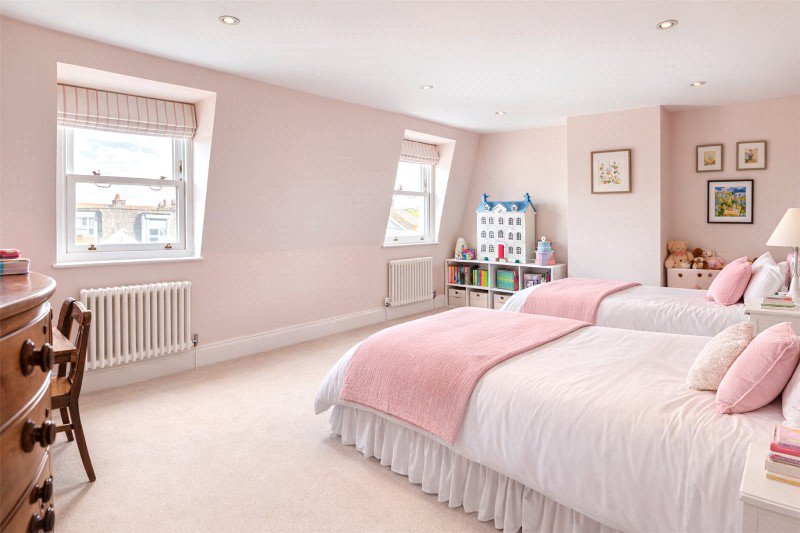 The second floor consists of a further three equal-sized double bedrooms that are served by a family style bathroom. The house has under-floor heating in the kitchen and all three bathrooms.