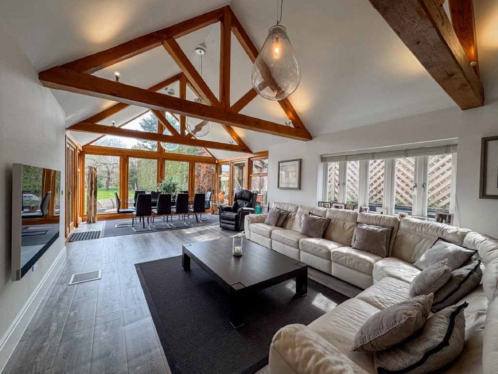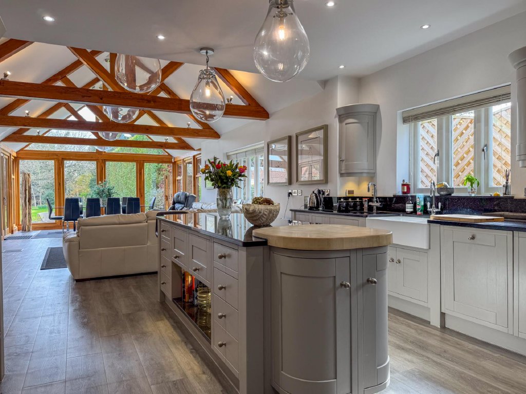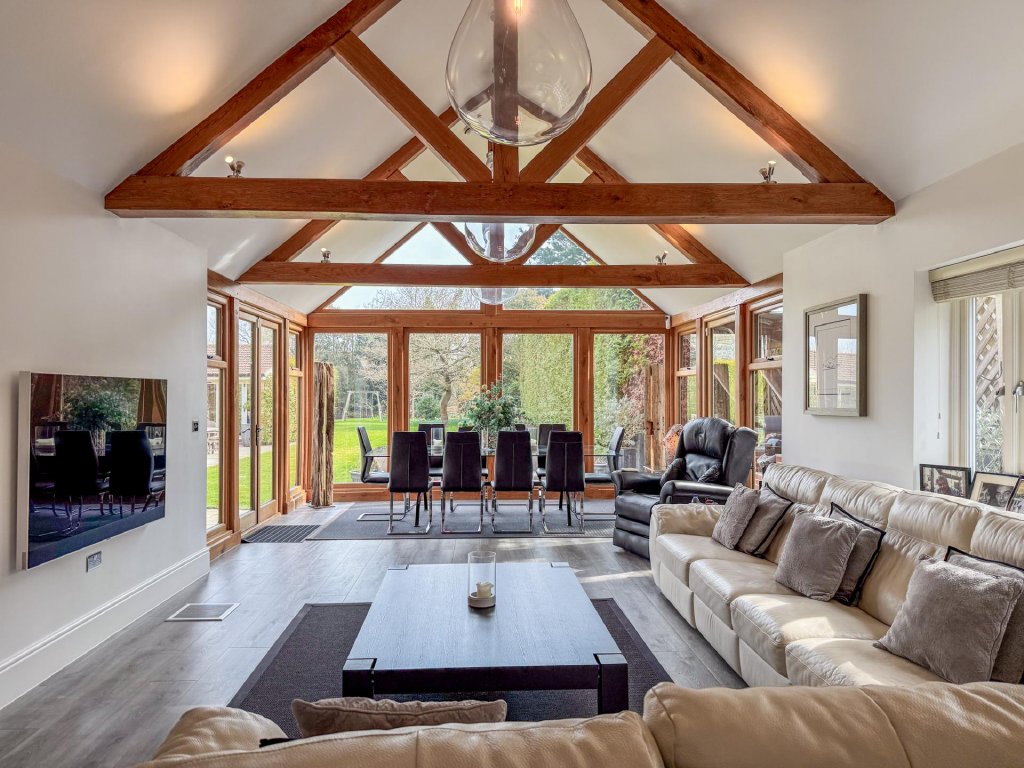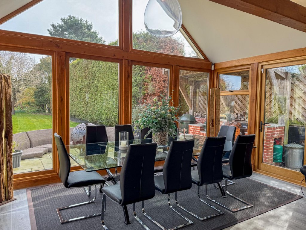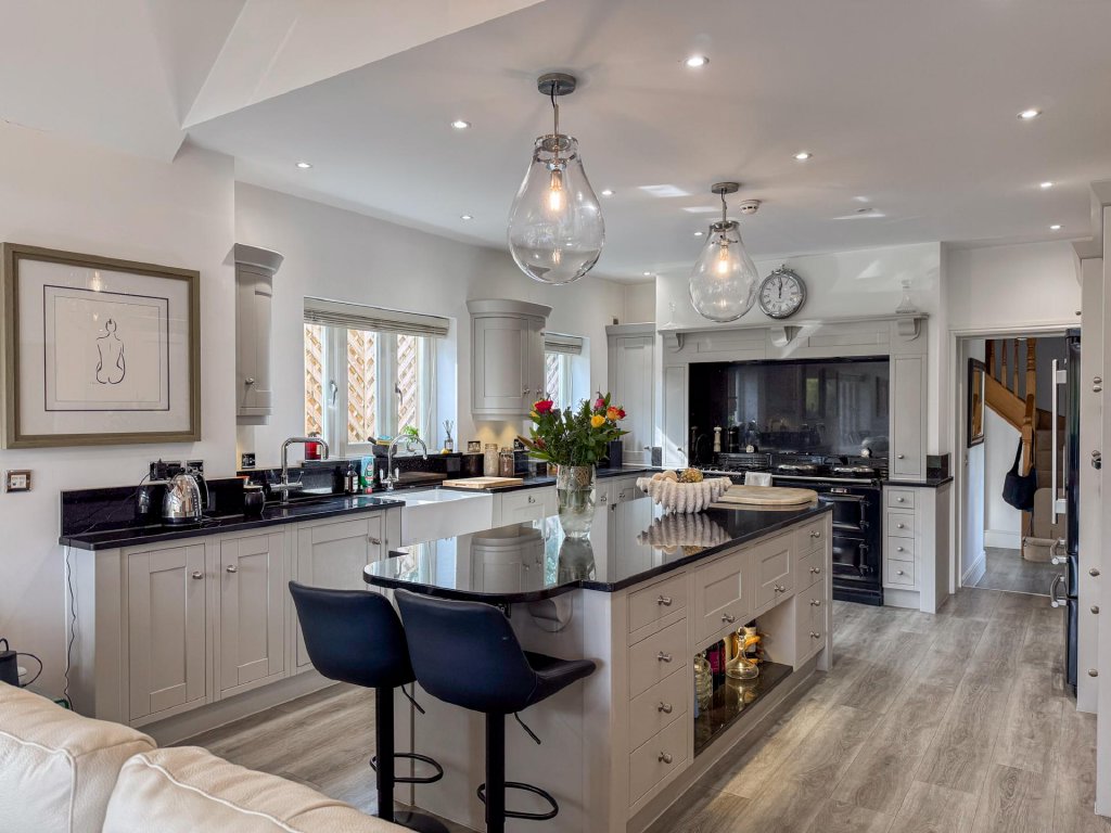The dining room leads seamlessly into the contemporary kitchen/family room, where floor to ceiling glazing, vaulted ceilings and skylights flood the room with natural light. This sleek and spacious area provides the perfect setting for everyday living, featuring a modern kitchen with a prominent Aga, extensive preparation space and a relaxed family area with views across the gardens.