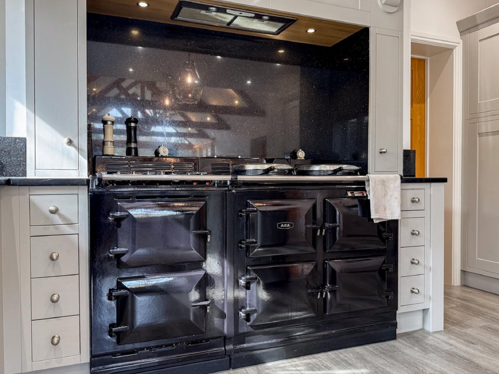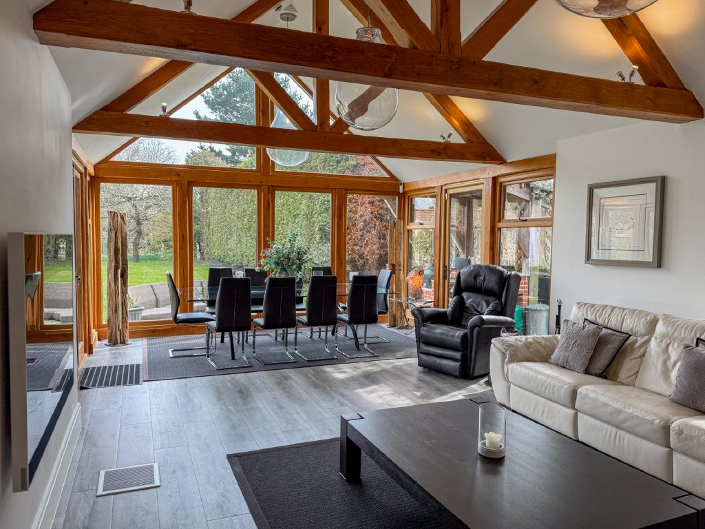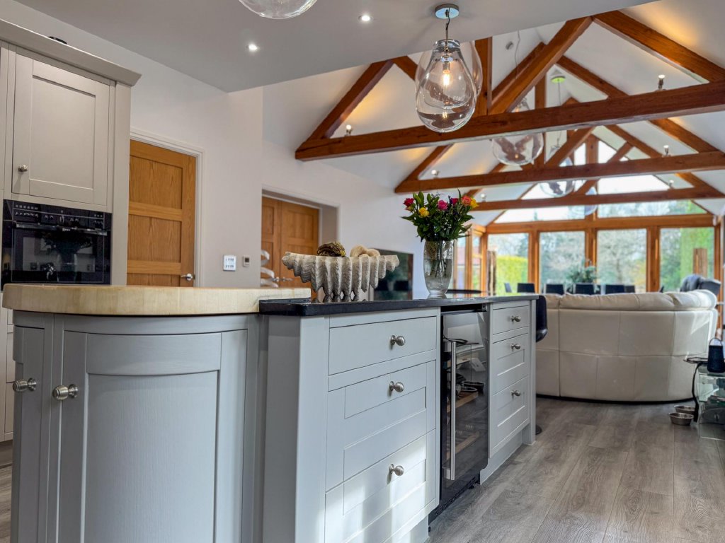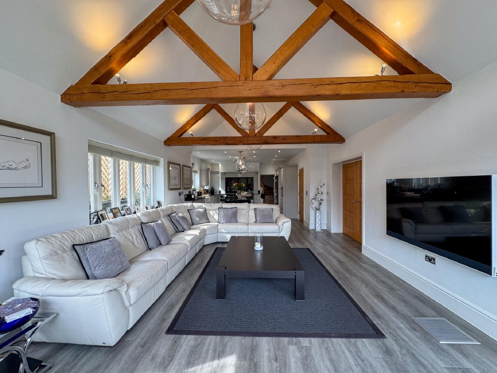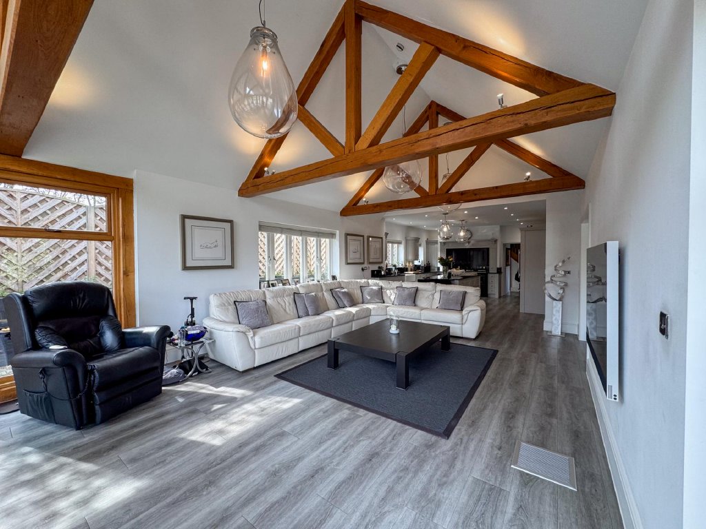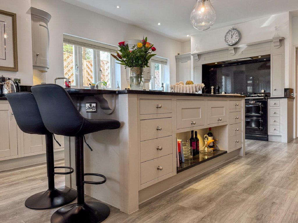 The dining room leads seamlessly into the contemporary kitchen/family room, where floor to ceiling glazing, vaulted ceilings and skylights flood the room with natural light. This sleek and spacious area provides the perfect setting for everyday living, featuring a modern kitchen with a prominent Aga, extensive preparation space and a relaxed family area with views across the gardens.