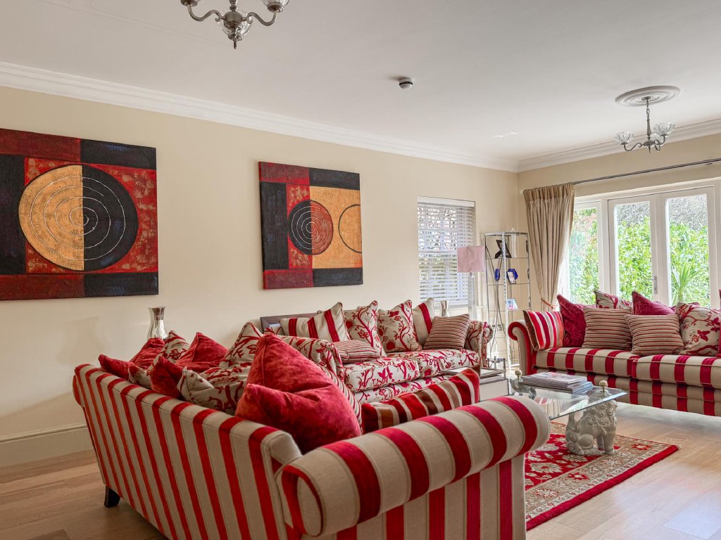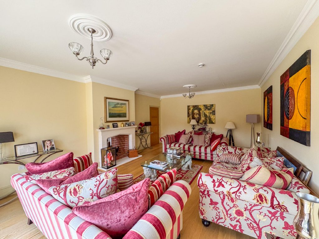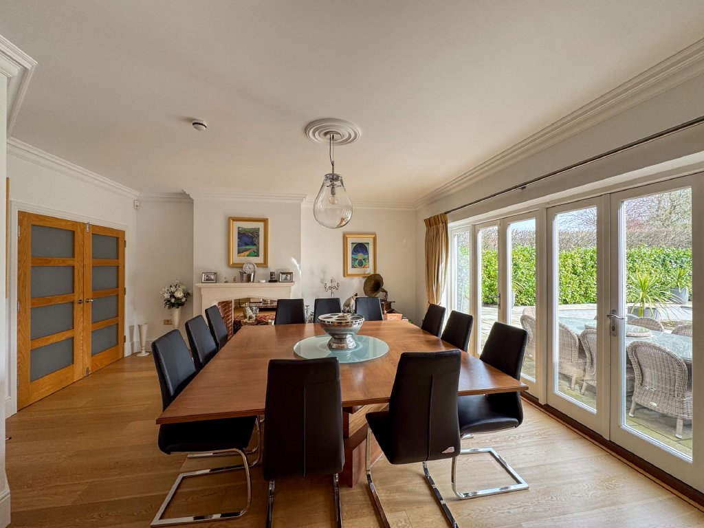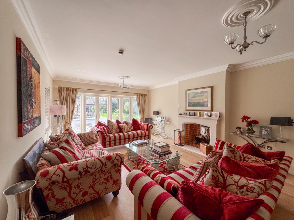 The ground floor offers a series of elegant and well-proportioned living spaces. The formal living room enjoys abundant natural light, a striking fireplace and bi fold doors that open fully to the terrace and gardens beyond.