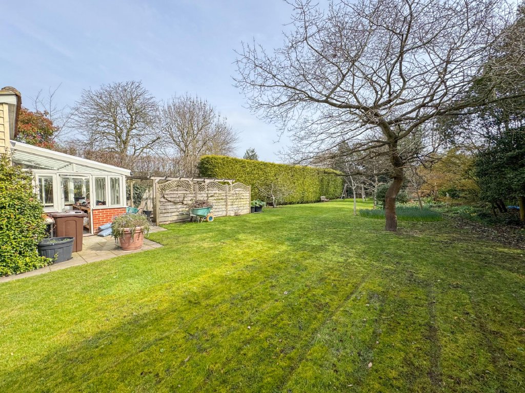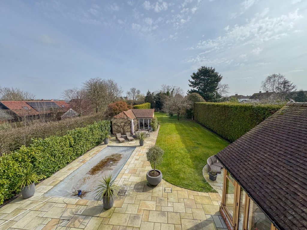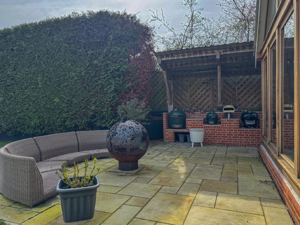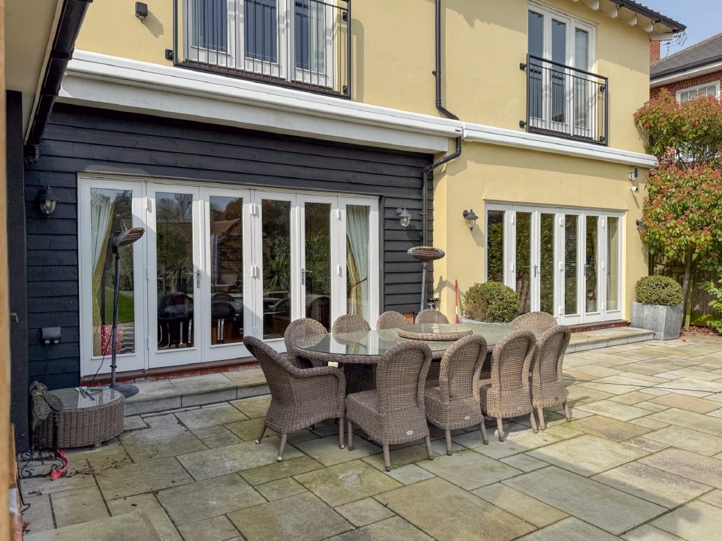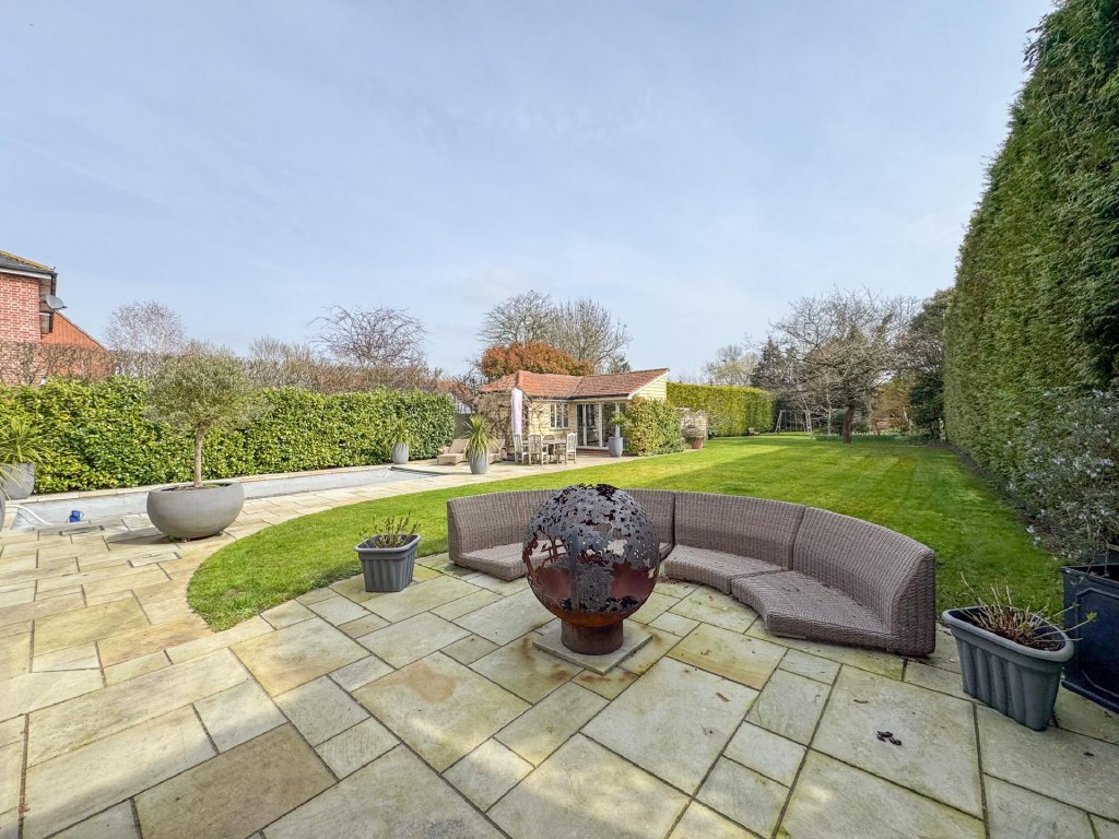 The rear garden begins with a wide, paved terrace that flows directly from the main living spaces, creating an effortless indoor-outdoor lifestyle. A contemporary outdoor kitchen offers an exceptional entertaining area, while the beautifully maintained lawns, mature planting and thoughtfully designed landscaping create a tranquil backdrop.