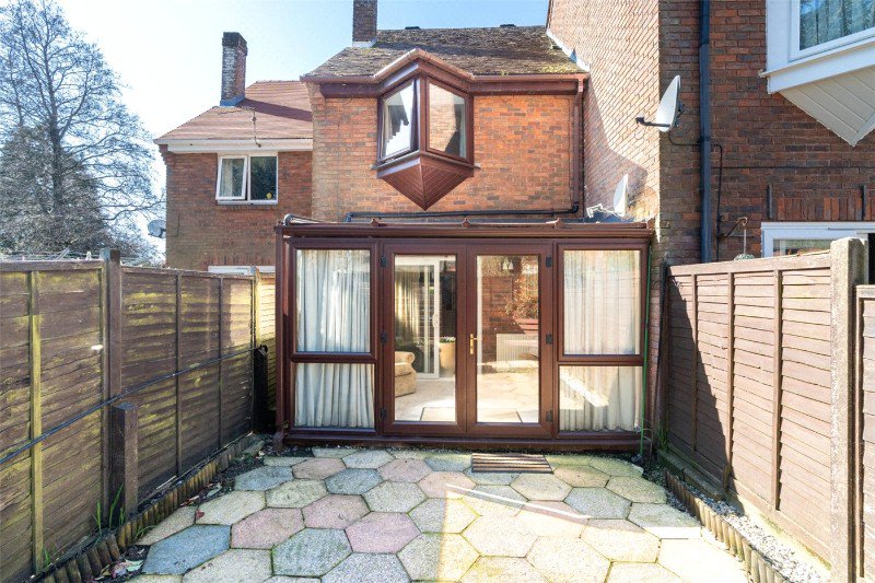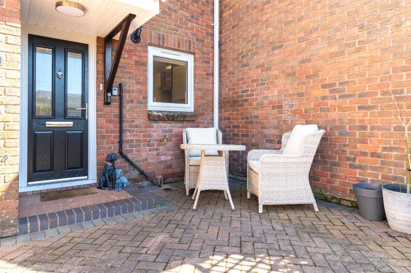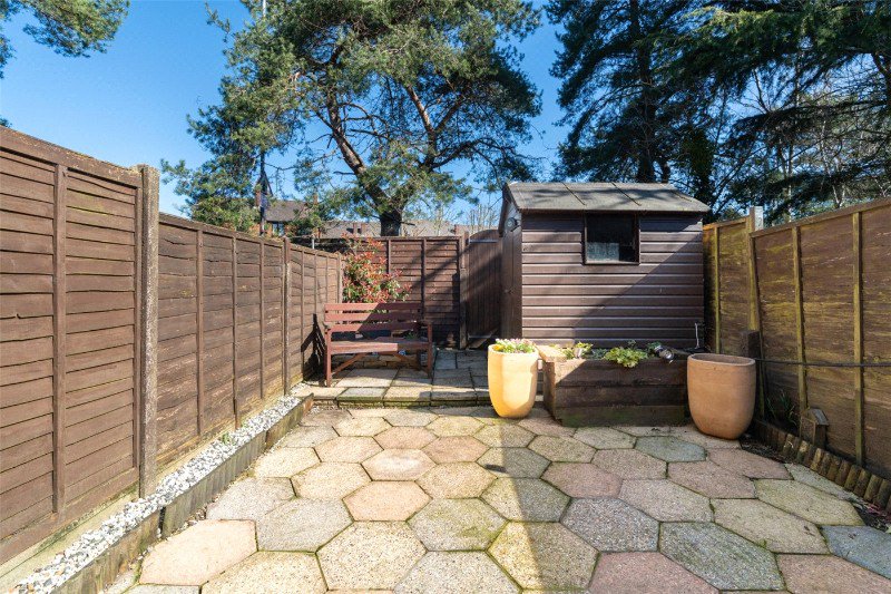 In front of the property there is residents’ parking which is available on a ‘first come, first served’ basis. The front garden is bounded by a picket fence, with a gate leading to a paved terrace with a raised planter. The nicely enclosed rear garden affords a fair degree of privacy and is paved for ease of maintenance, with timber shed and rear access gate.