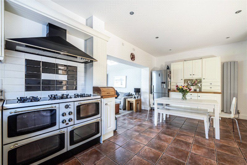 Towards the rear of the ground floor, the kitchen/dining room provides an ideal everyday living hub with generous workspace, modern cabinetry and a pleasant view over the garden. There is a further large family room with vaulted ceiling and French doors to garden. A downstairs cloakroom completes the ground floor.