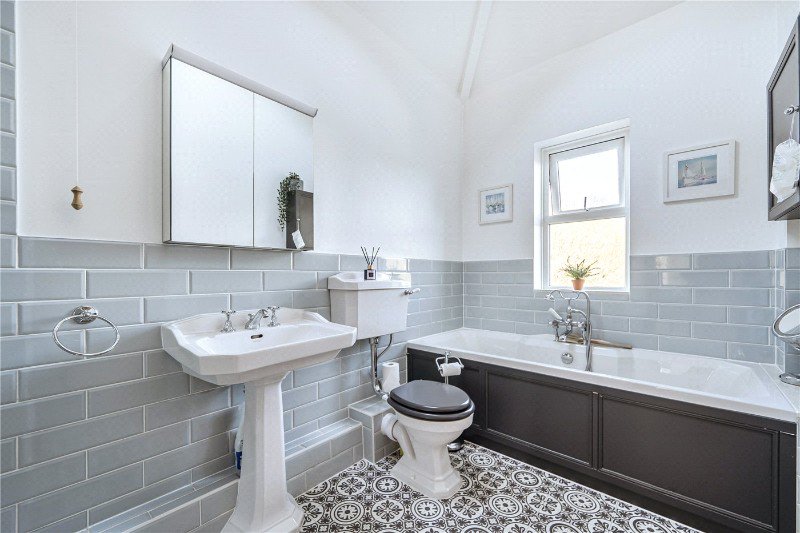 On the first floor, there are three bedrooms, each presented in a fresh, neutral style with good natural light. The refitted bathroom features a stylish suite, including a bath with separate shower, attractive tiling and modern finishes. From one of the bedrooms, a flexible ladder leads to the second floor loft room, providing excellent additional space for storage or occasional use.