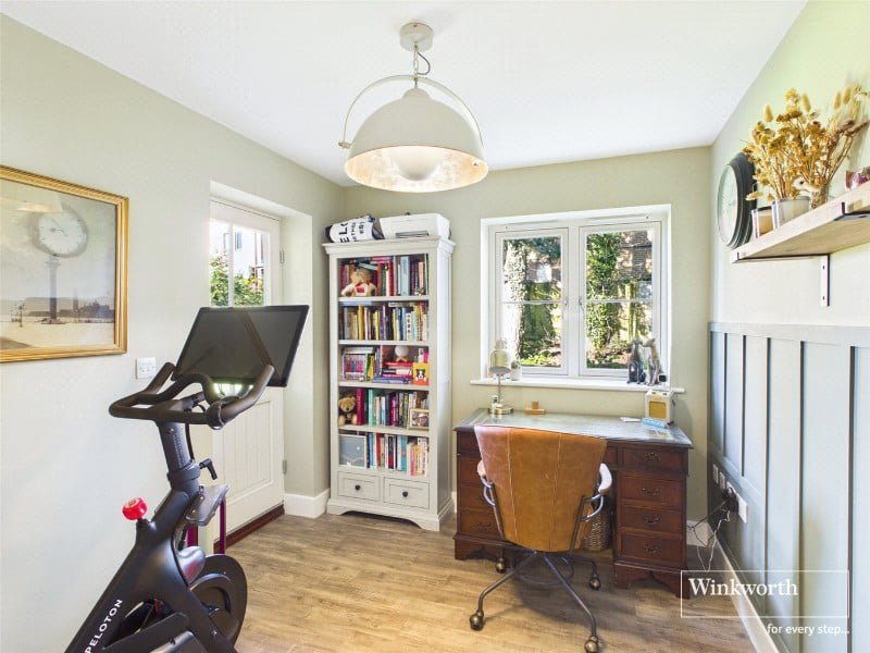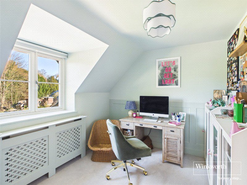 Upstairs, the first floor continues this theme of comfort and refinement. The principal suite offers a calm and private retreat, complete with a dressing area and a well-appointed en suite bathroom. A guest bedroom also benefits from its own en suite, while three further bedrooms are served by a stylish family bathroom — all finished to an excellent standard and thoughtfully laid out.