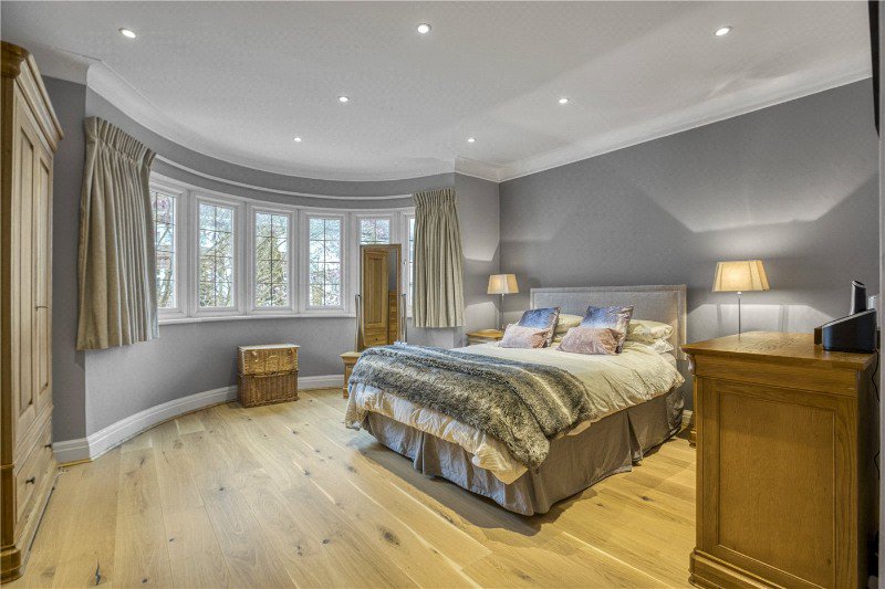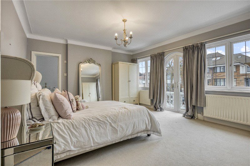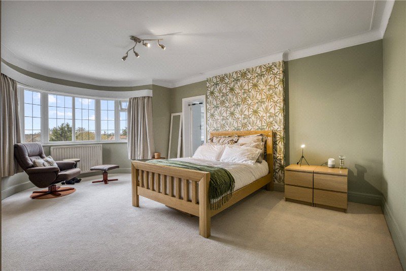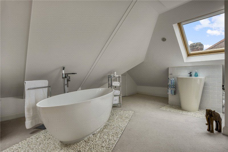 On the first floor, the principal bedroom suite enjoys generous proportions, fitted storage and a private en suite, along with access to a balcony. Additional well sized bedrooms are served by further bathrooms and en suites, creating a highly practical layout for family living. The second floor provides a large additional loft room with eaves storage and bathroom, ideal for guests, older children or as a private suite if preffered.