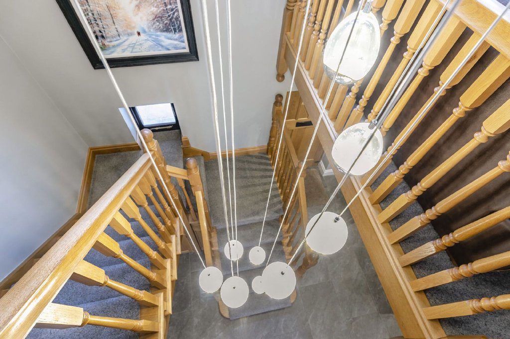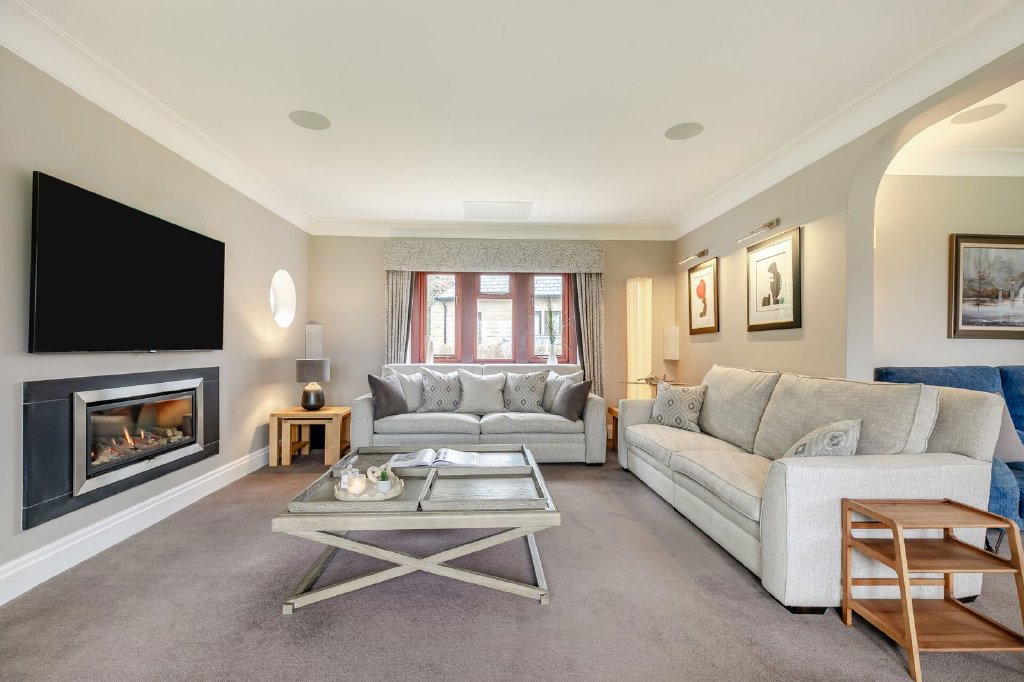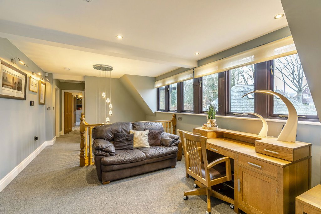 The galleried landing incorporates a sitting area with a bank of windows overlooking the front aspect, while a central chandelier descends elegantly to the hallway below. Access is also provided to the roof space which offers exceptional storage.