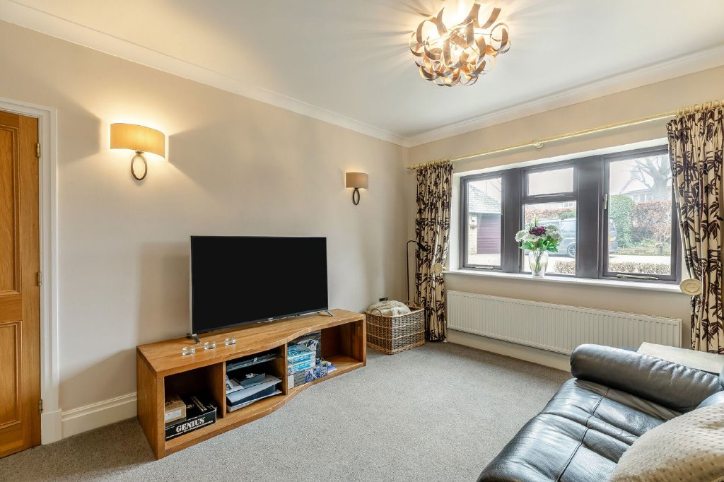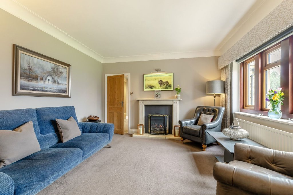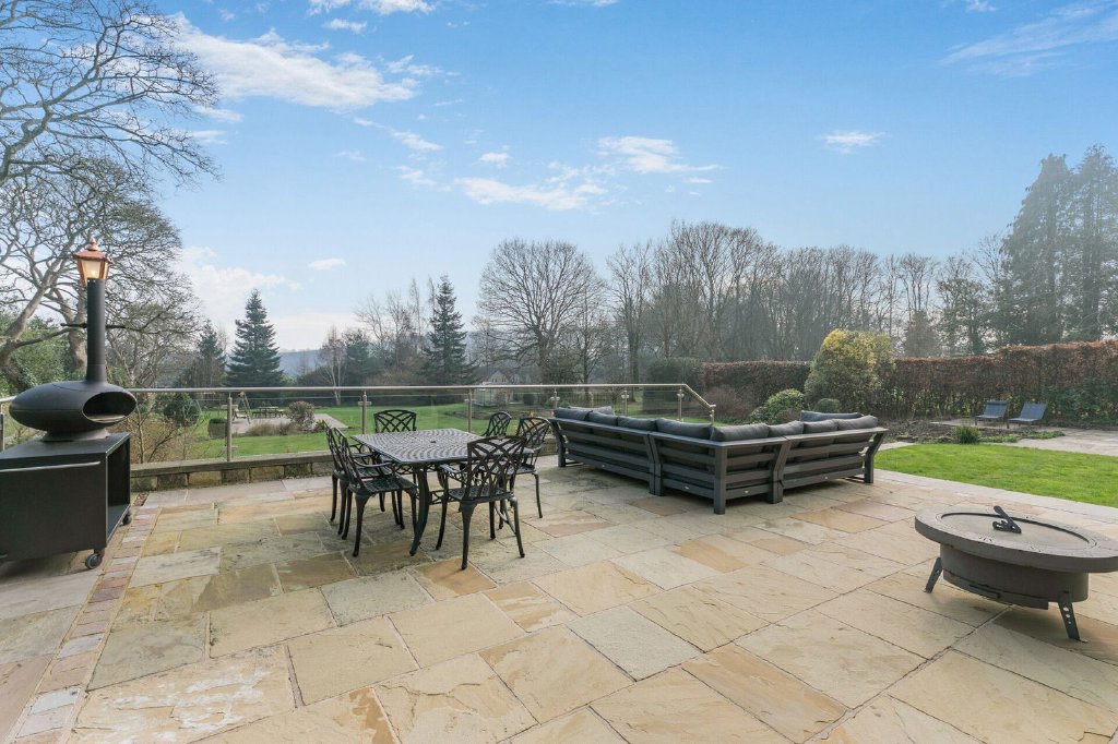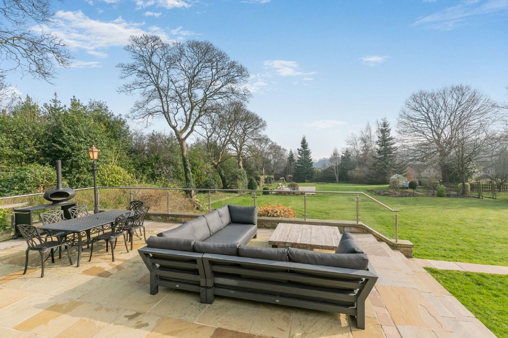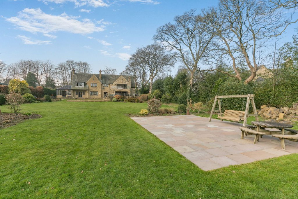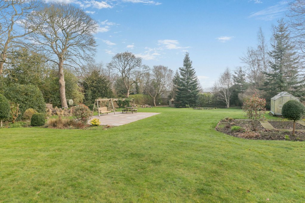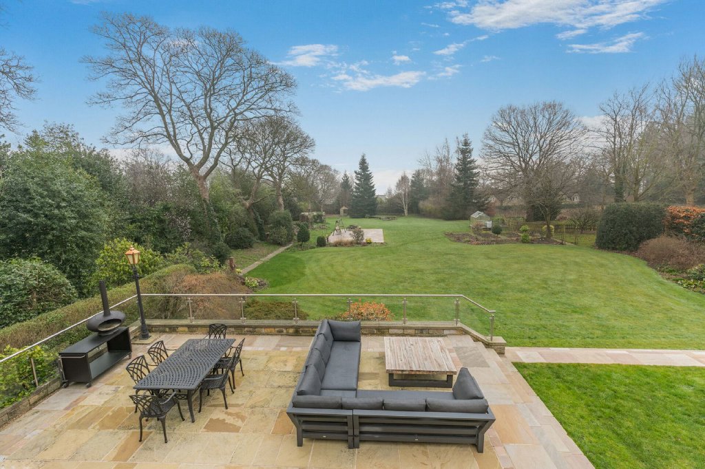 Immediately to the rear of the property, a flagged garden terrace adjoins the kitchen, lounge and garden room before stepping down to a generous lawned garden with established tree-lined borders, shaped planting beds, a second patio area and ornamental pond.