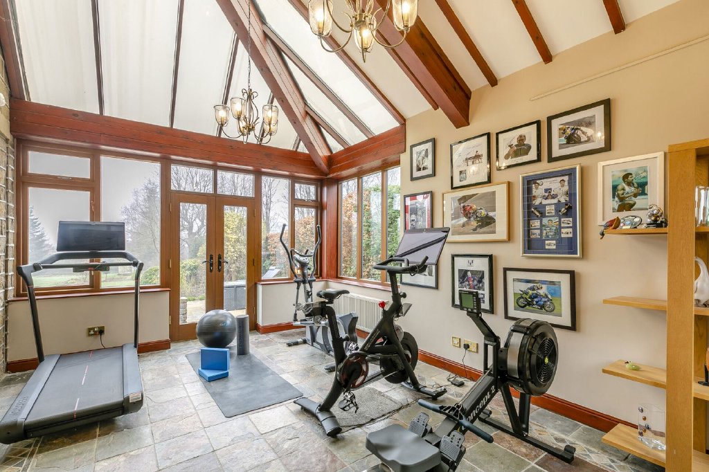 A home gym or garden room provides further versatile space, exposed to the apex of the roof with trusses and beams on display. The room features tiled flooring, windows to two aspects and French doors opening directly onto the garden.