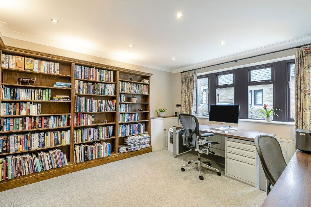 A sitting room provides versatile accommodation with a window to the front aspect. An office / study, also positioned to the front of the home, features a stone mullioned window and fitted shelving extending across two walls.