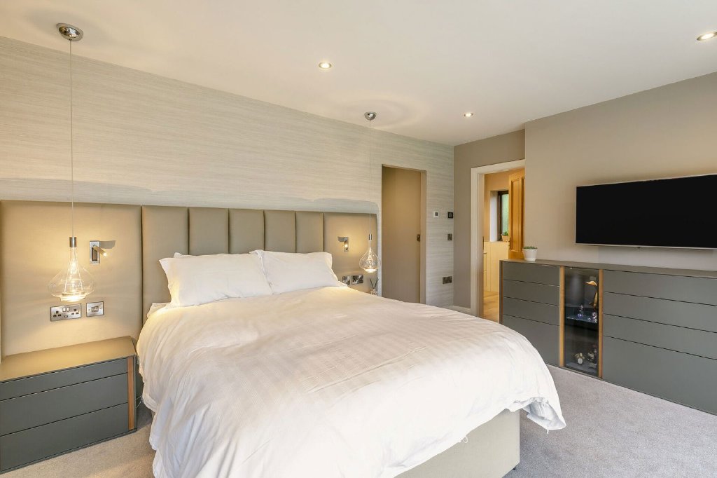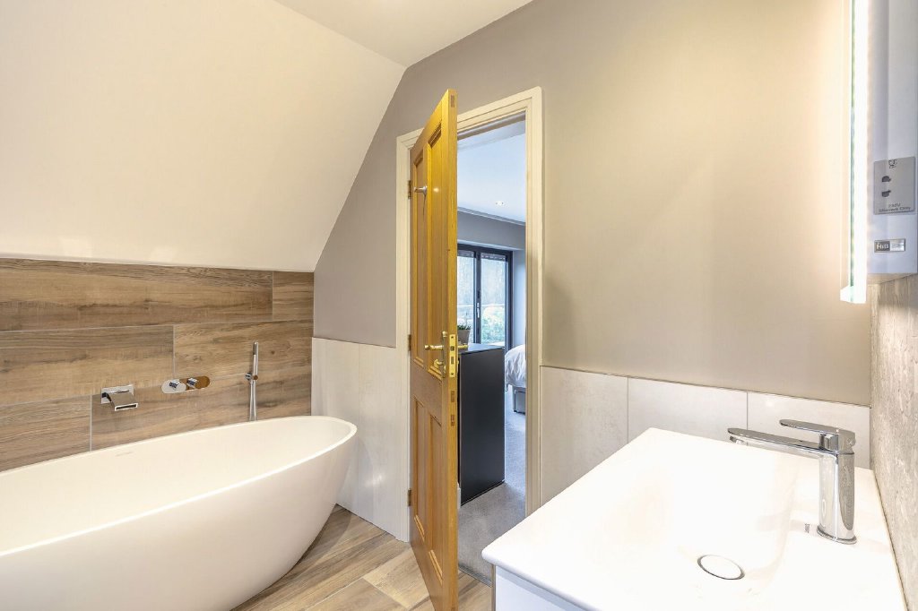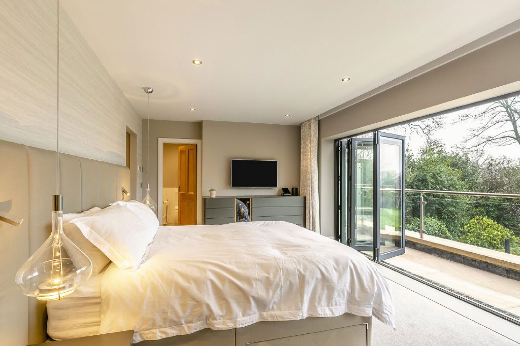 The principal bedroom suite provides generous and luxurious accommodation. The bedroom enjoys a side-facing window, while a bank of bi-fold doors opens onto a south-facing balcony, creating excellent natural light and providing a delightful outlook across the gardens with glimpses of the valley beyond.