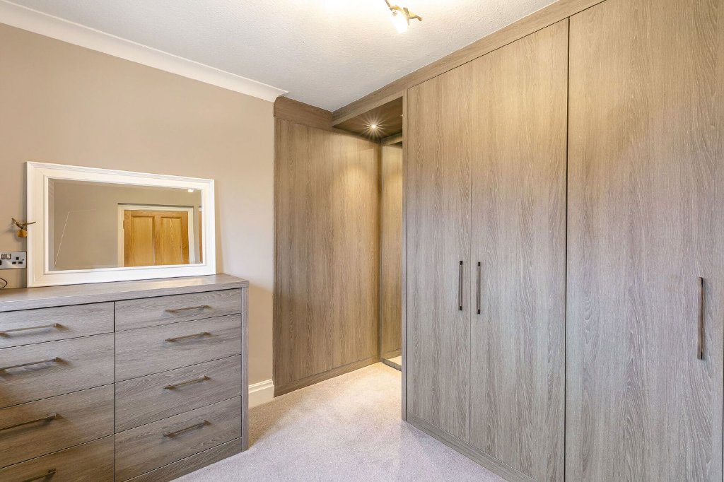 The suite benefits from a walk-in wardrobe with fitted cupboards extending across one wall, along with a separate dressing room overlooking the garden, fitted with wardrobes and drawer units to two walls.