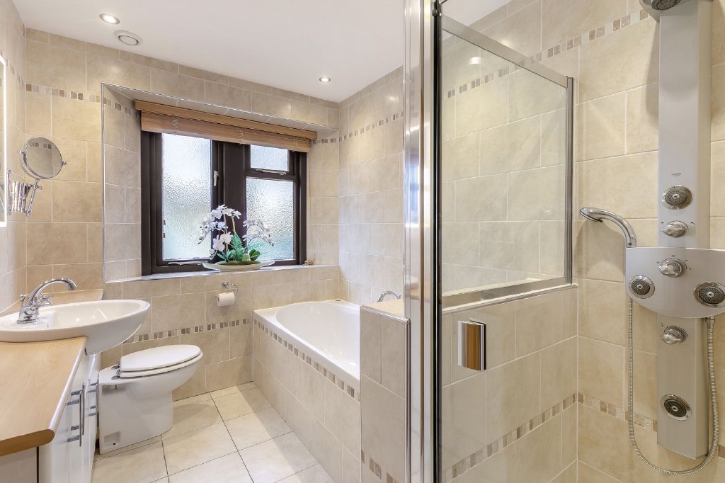 The third bedroom suite provides generous accommodation with windows to both front and rear aspects, the latter enjoying particularly attractive views. Fitted wardrobes extend across one wall incorporating drawer units, open shelving and an inset media wall for a television. The en-suite features a double-ended bath, vanity unit with wash basin, W.C. and shower with jet sprays, complemented by tiled walls and floor and an opaque window.