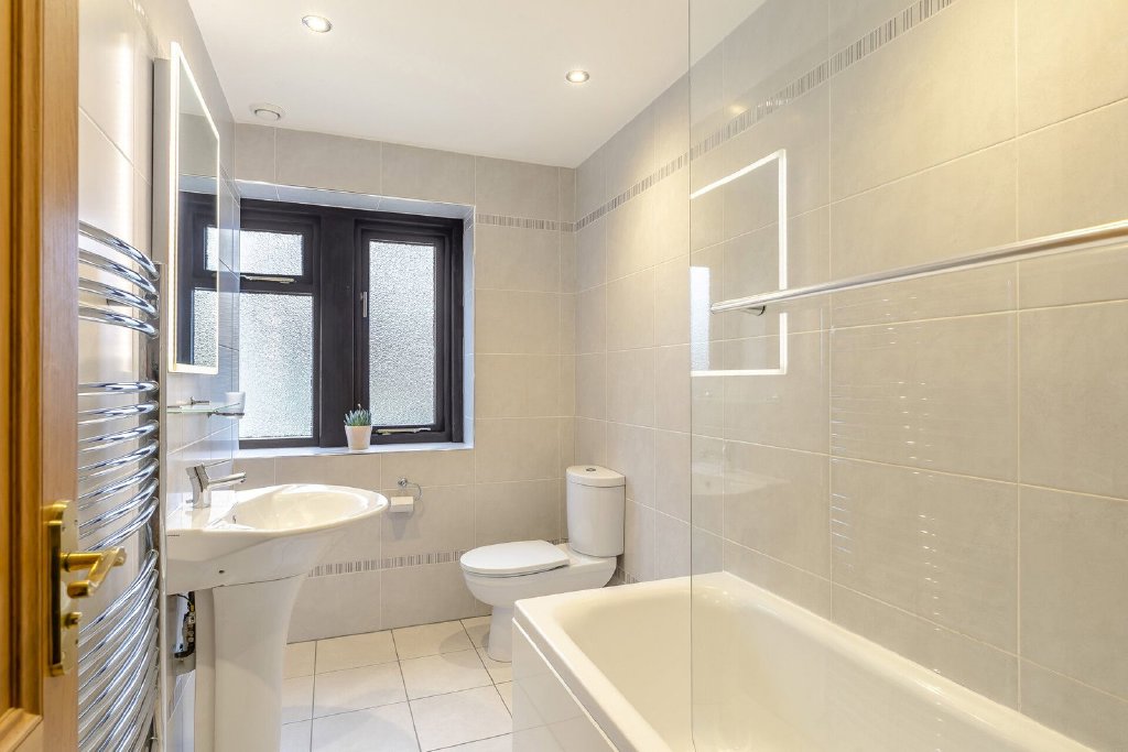 The family bathroom is presented with a three-piece suite finished in white comprising a bath with shower over, low flush W.C. and pedestal wash hand basin. The room features tiled walls and floor, an LED-lit mirror, window with opaque glass and heated towel rail.