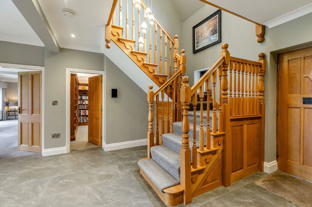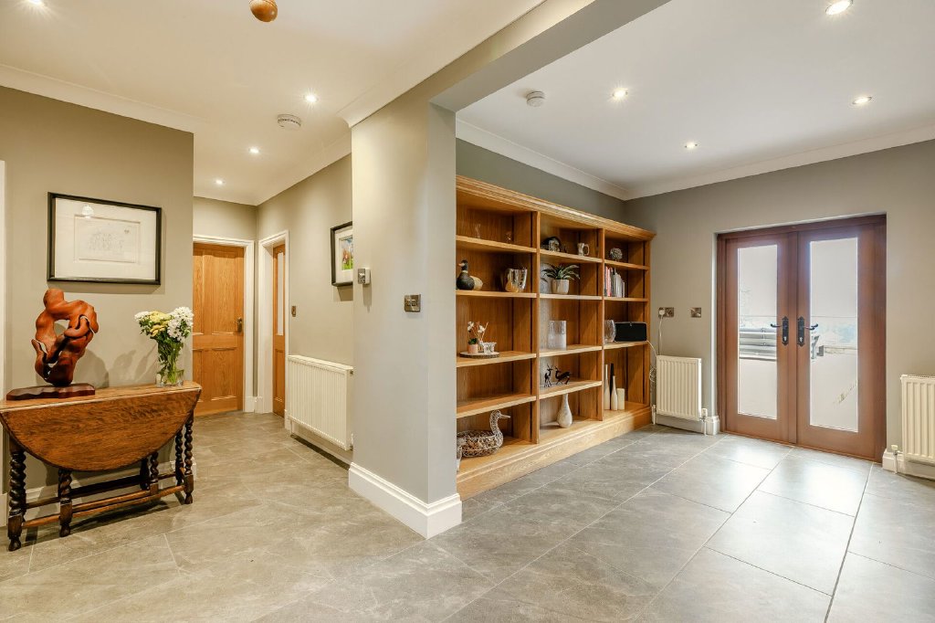 An elegant entrance portico shelters a solid oak door which opens into an impressive reception hallway featuring full floor tiling and a bespoke oak staircase with spindled balustrade rising to a galleried landing above. Open-fronted library shelving spans two walls, while twin doors open directly onto the rear garden. A high-level window draws natural light into the space.
