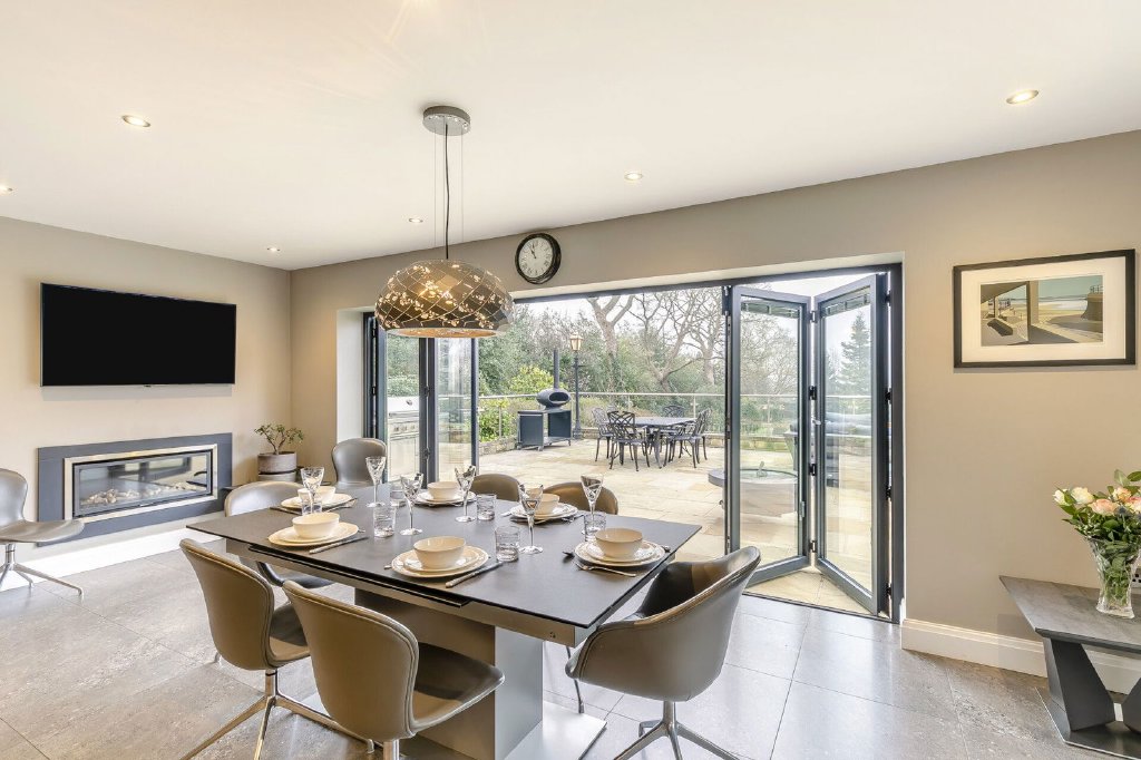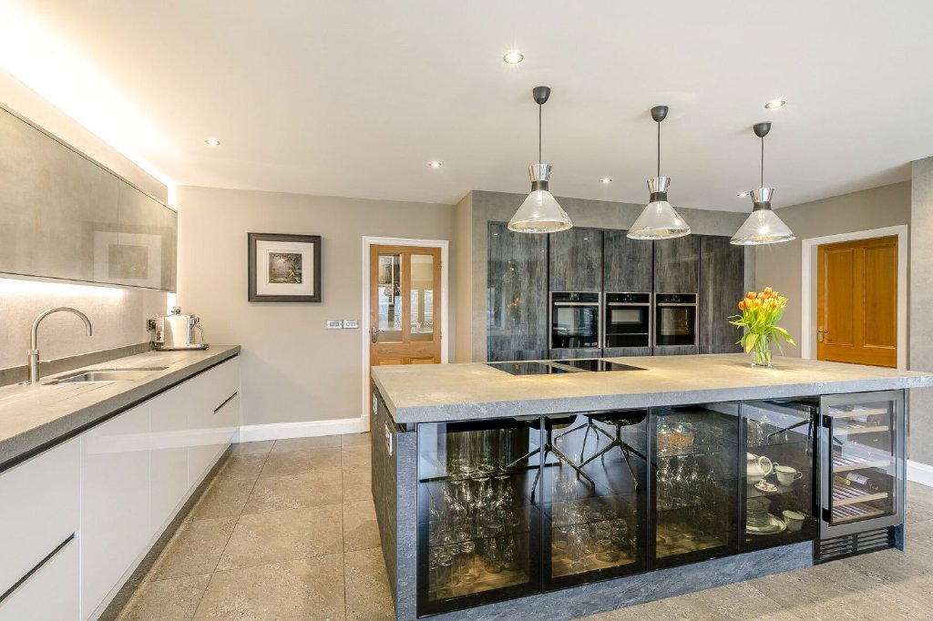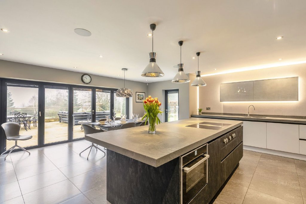 The living kitchen forms the true hub of the home, offering an expansive and highly sociable entertaining space with inset speakers to the ceiling. A bank of bi-folding doors opens directly onto the south-facing terrace, encouraging al fresco dining and seamlessly connecting indoor and outdoor living. The room features full floor tiling with under floor heating throughout and an inset gas fire set to one wall. A comprehensive range of bespoke cabinetry is complemented by polished concrete work surfaces incorporating a double drainer and inset stainless steel sink with Qooker fusion tap for hot, cold and boiling water. A central island incorporates a Bora hob with downdraft extractor, extends to form a breakfast bar, and features glass-fronted cabinetry beneath. Integrated appliances include twin ovens and warming drawer, combination oven and microwave, dishwasher, full-height fridge freezer, wine chiller, and a larder pantry cupboard.