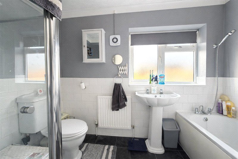 To the first floor are three well-proportioned bedrooms. The master bedroom is a generous double with built-in wardrobes. Bedroom Two is also a comfortable double, while Bedroom Three provides flexibility as a child’s bedroom, nursery or study. The family bathroom is fitted with a white suite comprising bath, separate shower cubicle, wash basin and WC.