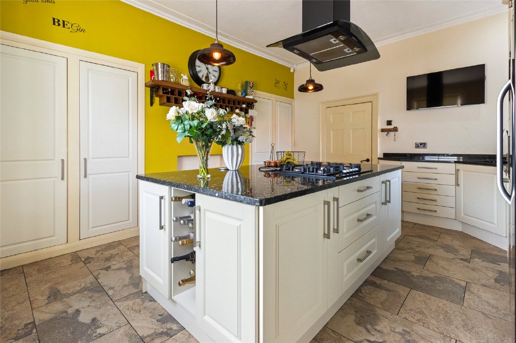 The kitchen seamlessly blends modern convenience with traditional styling, offering a range of cream-coloured units housing high quality fitted appliances. A large central island with granite work surfaces provides a striking contrast against the original recessed cupboards, creating a sociable space at the heart of the home for both cooking and everyday living.
