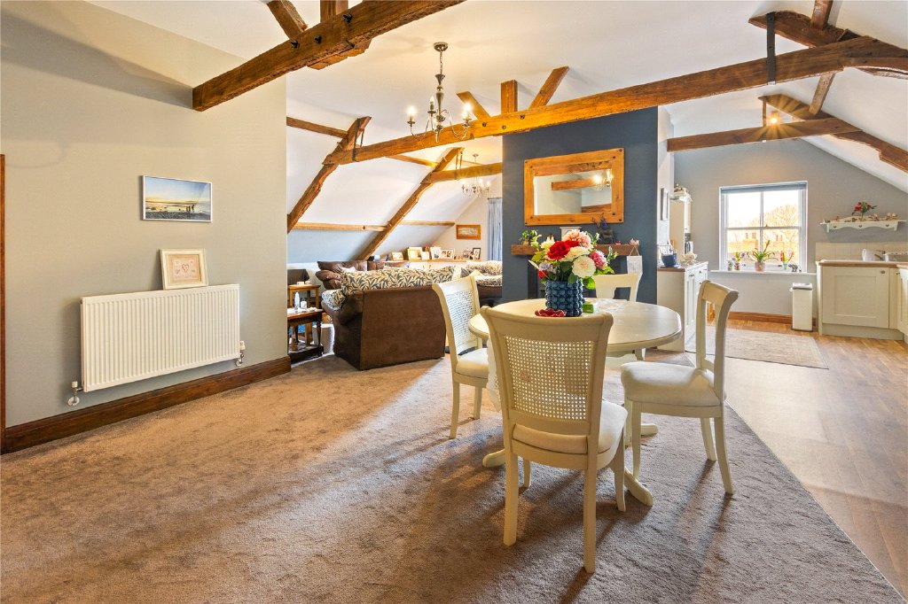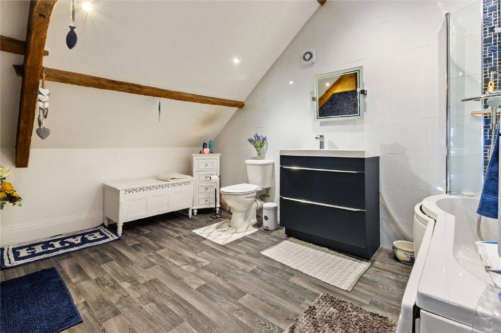 The second floor has been converted into an incredible, spacious loft style apartment comprising of an open plan living, dining and kitchen, a double bedroom five and a smaller sixth bedroom and the modern bathroom has a three-piece bathroom to include a P-shaped bath with shower over. Rich in character, this delightful space features exposed beams, timber structures and far-reaching views over the town’s rooftops, offering independent yet connected living for extended family or guests.