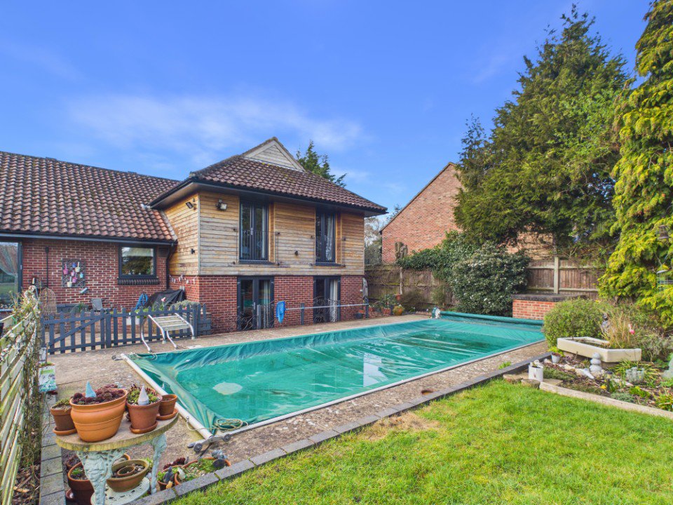 This is a distinctive and beautifully presented detached home, set well back from New Road within approximately 0.57 acres in the desirable village of Fritton. Approached by a long gravel driveway and framed by lawns, mature planting and woodland views to the front, the property offers an immediate sense of privacy and arrival. Its design combines traditional red brick elevations with a more contemporary architectural twist, creating a home that feels individual, spacious and well suited to modern living.