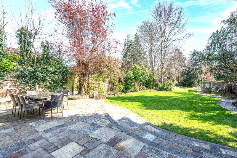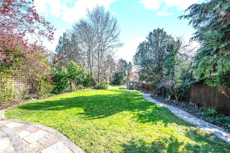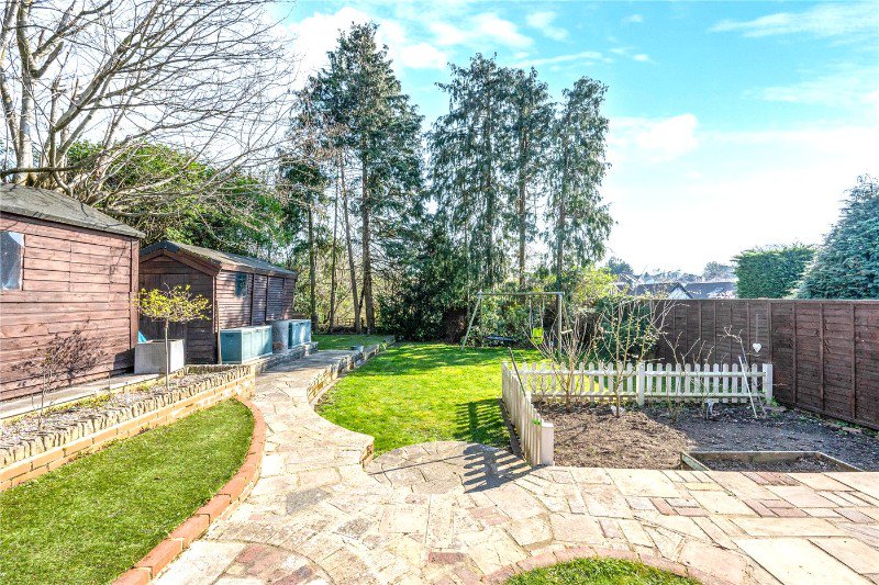 The attractive rear garden has a private and secluded feel with mature hedge borders, and has a south facing aspect. A large patio adjacent to the house runs the width of the property, which is an ideal area for a BBQ and seating overlooking the lawn. The perimeter of the garden is framed by well stocked shrub beds. There are also two useful garden sheds for storage.