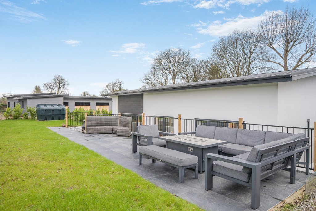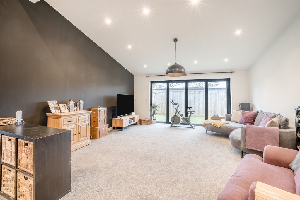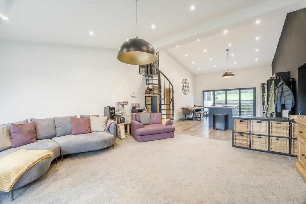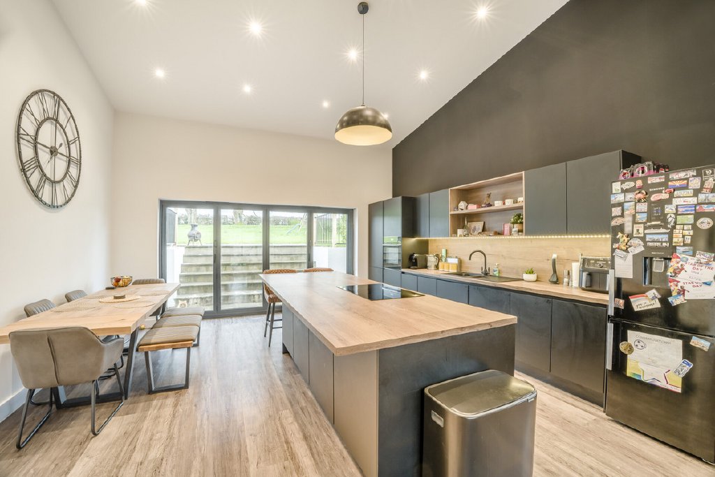 Inside, the property centres around a spacious open-plan kitchen and living area. Two sets of bi-fold doors allow plenty of natural light and open directly onto the garden and grounds beyond. The kitchen features a central island, integrated appliances and modern cabinetry, with a separate utility room providing additional storage and convenience.