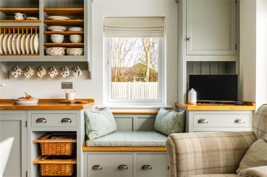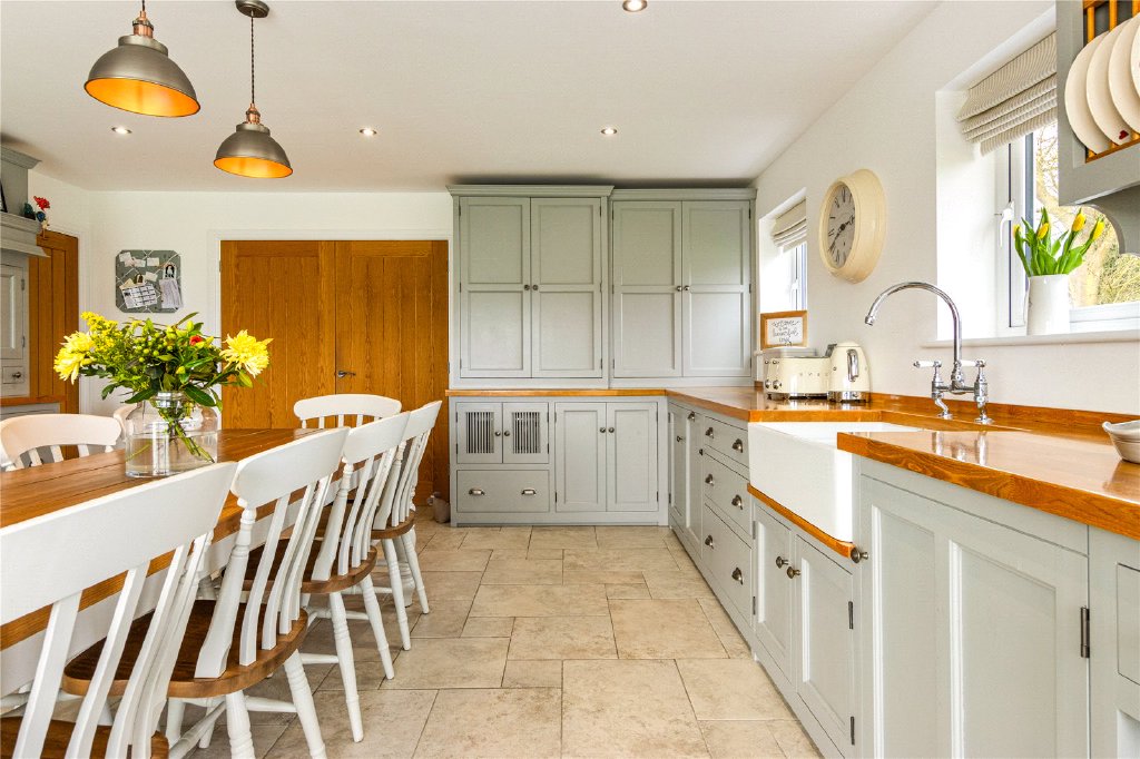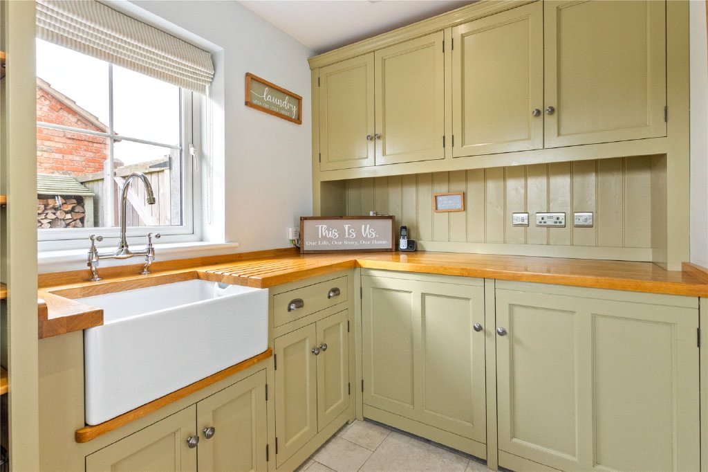 This space opens into the stunning farmhouse-style kitchen, a room very much at the heart of the home and flooded with natural light from south-facing bi-fold doors. Beautifully fitted with bespoke Murdoch Troon shaker-style units with oak detailing, the kitchen has both warmth and presence. A Belfast sink provides a striking focal point, while fitted appliances and an impressive surround framing the range cooker add to the carefully considered finish. There is ample space for a large farmhouse table, making this the perfect room for relaxed family meals, entertaining friends or gathering on special occasions. Off the kitchen is a utility room, fitted to the same exacting standard in a contrasting colour, with a door opening directly onto the rear garden.
