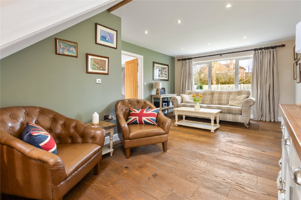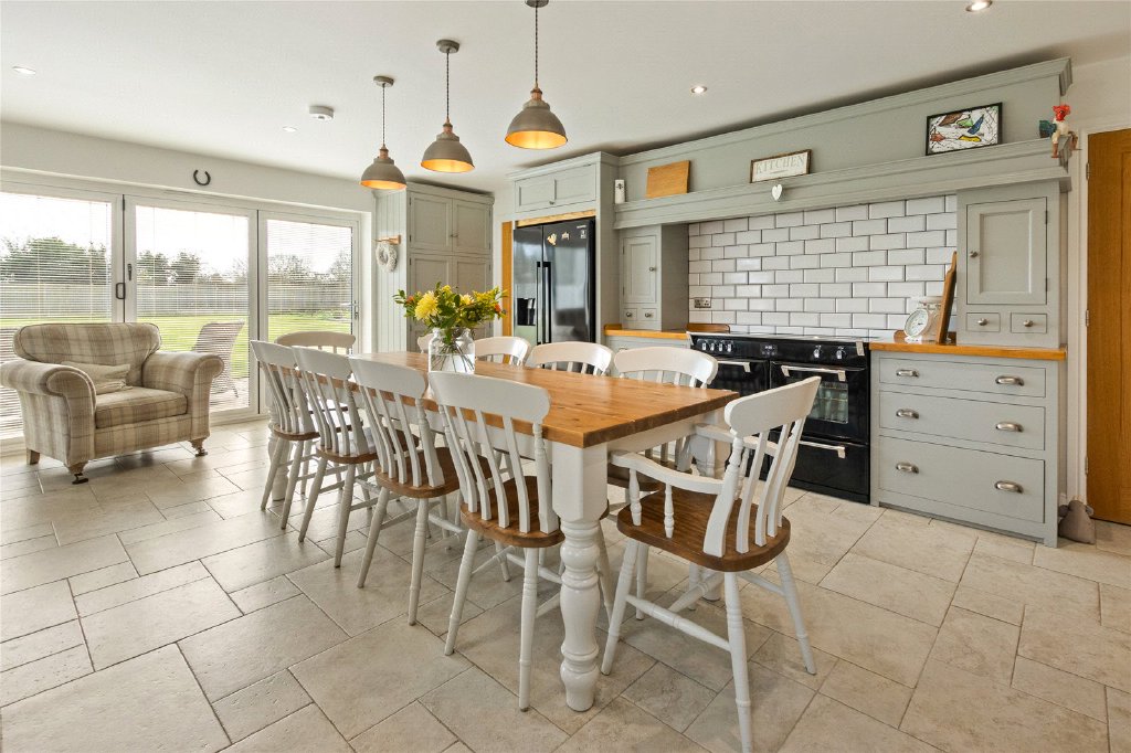 Beyond the kitchen, double oak doors open into the first reception room, a versatile dual-aspect space that could serve equally well as a formal dining room, a second sitting room or a family room.