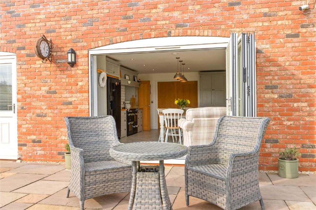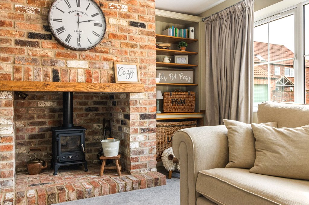 Leading through from here is the formal sitting room, a room of generous proportions running the full width of the house. Rich in atmosphere, it blends the home’s traditional inspiration with modern comfort, featuring a brick chimney breast with recessed wood burner as its focal point. Bespoke cabinetry has been cleverly incorporated to create elegant display storage, while French doors open directly onto the garden.