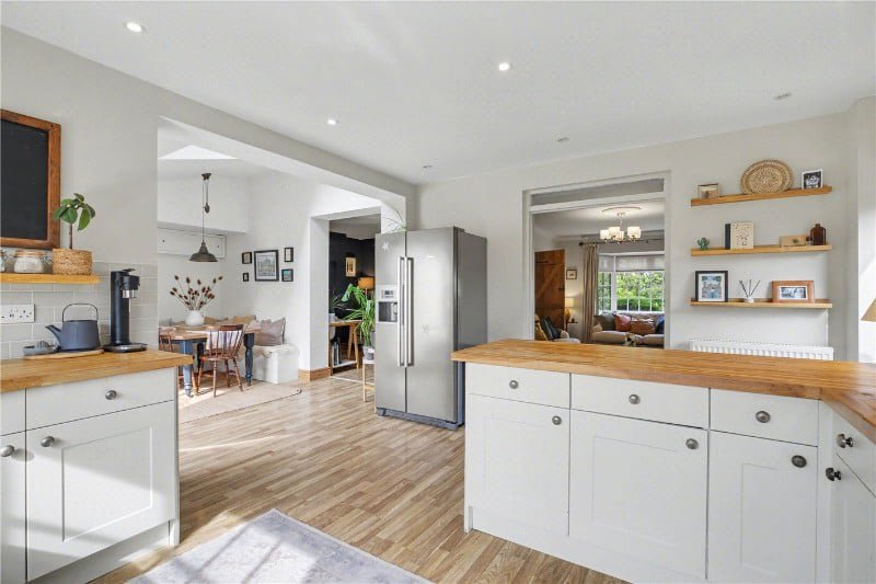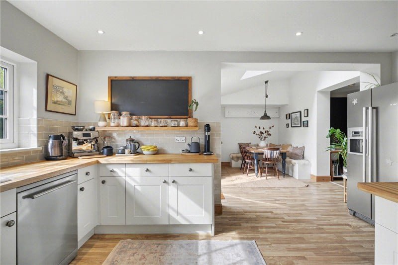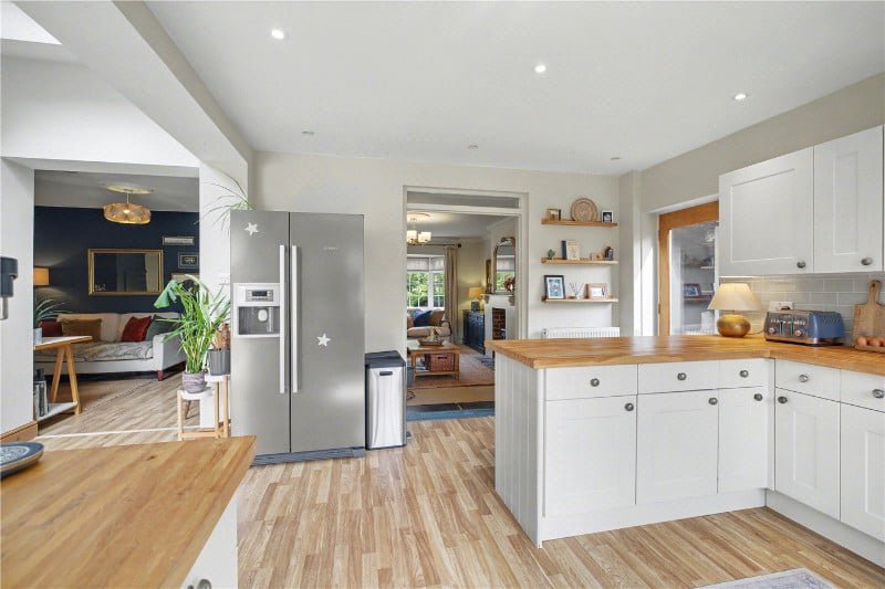 The kitchen is unquestionably the focal point, designed not just for cooking, but for living. A generous arrangement of shaker-style cabinetry is paired with extensive woodblock work surfaces and a peninsula island with breakfast seating, creating a space that works equally well for busy mornings, family time, or entertaining. A range-style cooker sits at the heart of it, with wide windows over the sink drawing in natural light and connecting the space to the garden beyond.