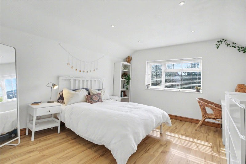 Upstairs, the feeling of space continues. The principal bedroom stands out immediately, with its vaulted ceiling creating both height and drama, while remaining calm and inviting. Two further bedrooms are well-proportioned, complemented by a beautifully finished family bathroom that blends classic styling with modern convenience.