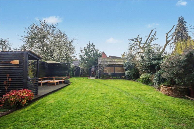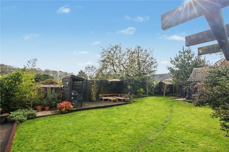 Outside, the plot is a genuine standout. The rear garden is both generous and private, with a wide expanse of lawn framed by mature trees and established planting, creating a setting that feels both open and secluded.