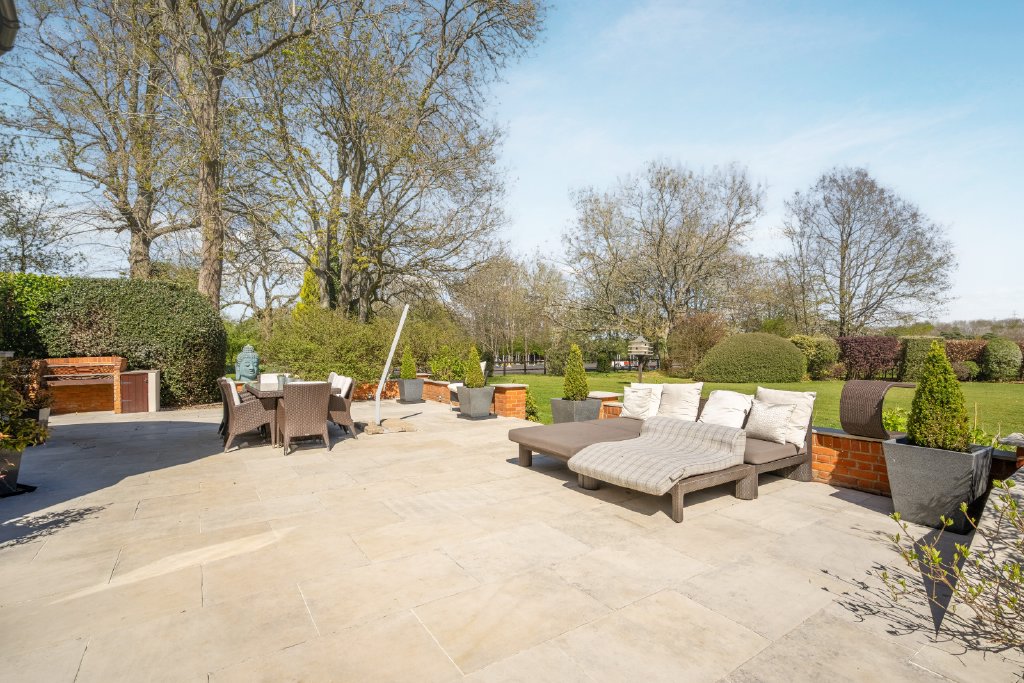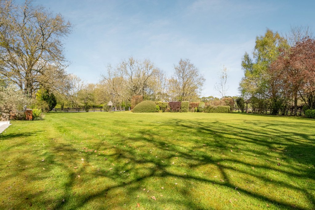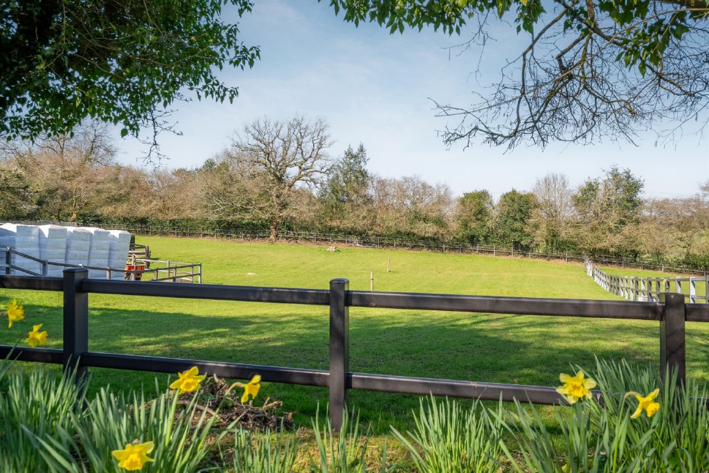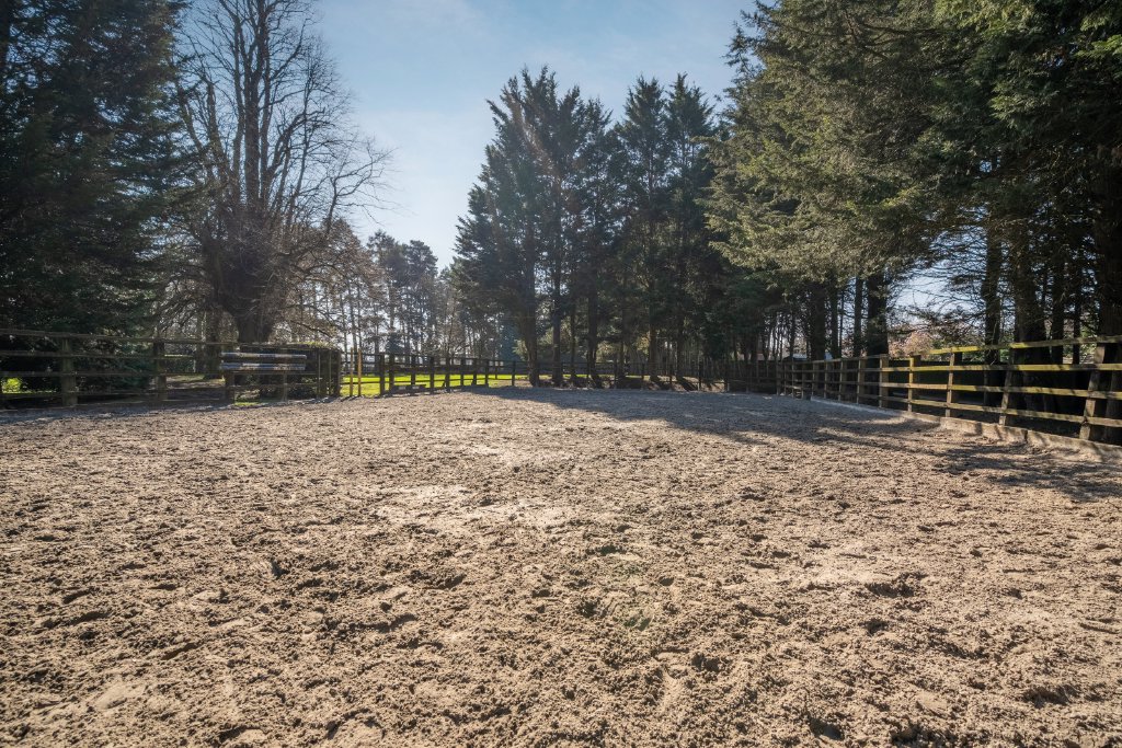 The property is approached via electrically operated wrought iron gates opening to a gravel drive. Surrounding the house are beautifully maintained formal gardens featuring a large stone terrace, topiary hedging, and mature trees. Beyond lie the extensive paddocks, enclosed with post-and-rail fencing and bordered by woodland, providing a superb rural outlook and a sense of open space.