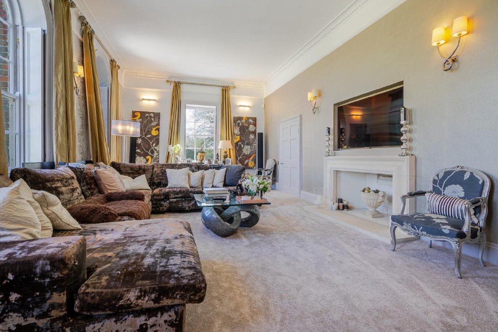 The grand front door leads into a bright lobby and hallway with the sweeping central staircase. Reception rooms include the elegant drawing room featuring floor-to-ceiling sash windows, original coving, and a grand fireplace and the former dining room (now a treatment room), both showcasing classic period details. The impressive kitchen/breakfast room is accessed through the boot room or directly from the drive via stone balustraded steps. Fitted with bespoke Mark Wilkinson cabinetry and high-end appliances, the kitchen flows into a dining area beneath a vaulted ceiling, with French doors opening onto the gardens.