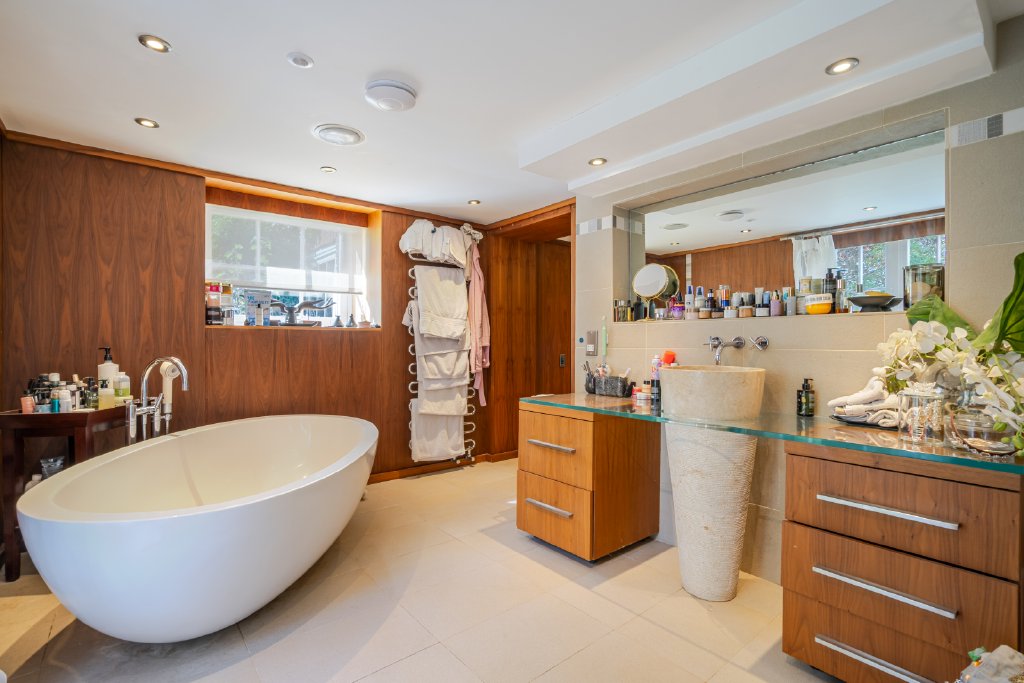Originally housing the kitchens and sculleries, the lower ground floor now features a spacious home office with bespoke cabinetry, panelled walls, and Travertine flooring. The principal bedroom suite occupies this level, accessed via elegant walnut doors, and includes underfloor heating, a luxurious bathroom with a freestanding bath and steam shower, and two fully fitted dressing rooms.