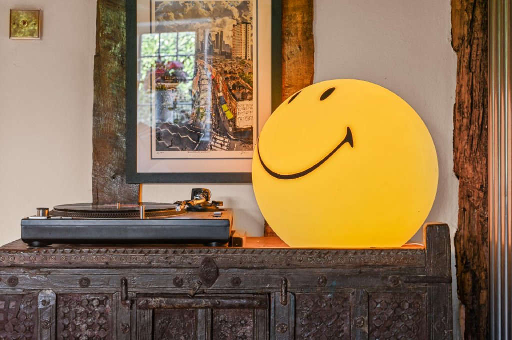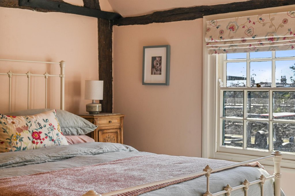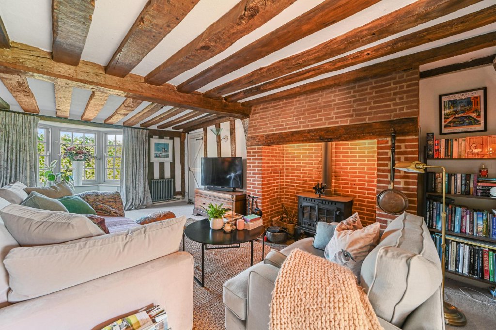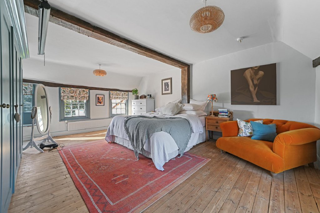 To the left is the lounge, a beautifully proportioned reception room with dual aspect windows that fill the space with natural light. With exposed timbers and a feature fireplace, it offers a warm and inviting setting for relaxed evenings or entertaining. Beyond the lounge is a separate study.