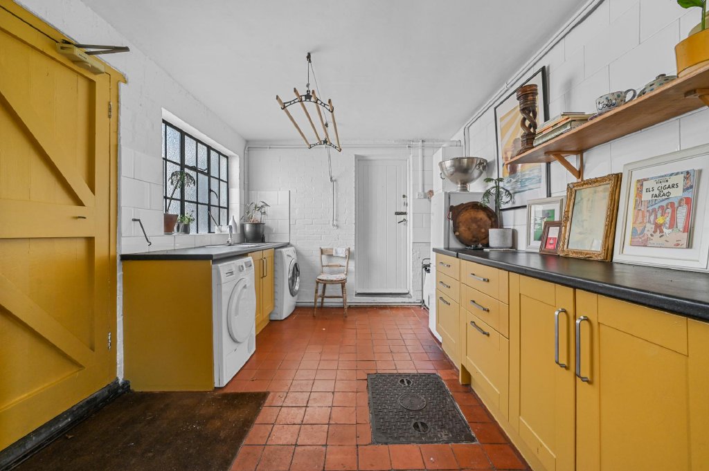 The kitchen is fitted with ample storage and workspace, with large windows letting in natural light, the room is complemented by a useful pantry. From here, a lobby leads to the cloakroom, as well as through to the utility room, which provides additional appliances, storage, and convenient access to the outside.