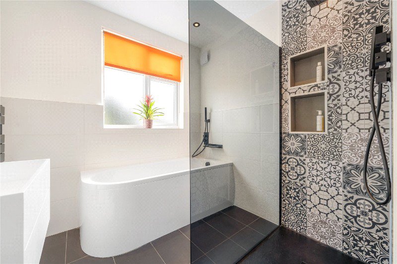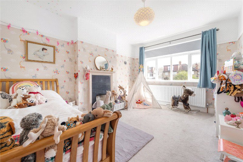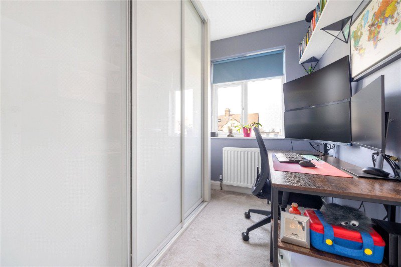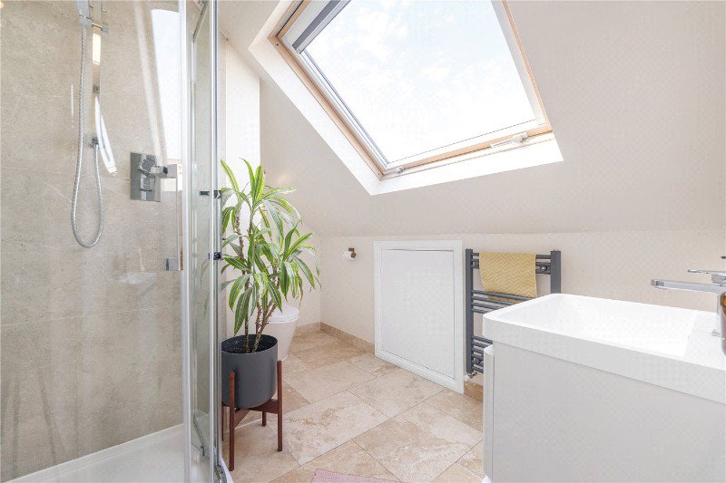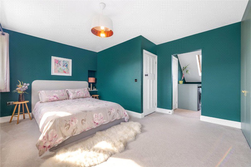 The upper floors continue to impress. The first floor comprises three well-proportioned bedrooms, including a particularly generous principal bedroom with a bay window, alongside a modern family bathroom. The second floor adds further versatility, with an additional large bedroom suite, a second bathroom, and useful eaves storage—ideal for guests or growing families.
