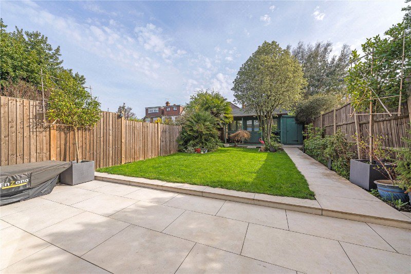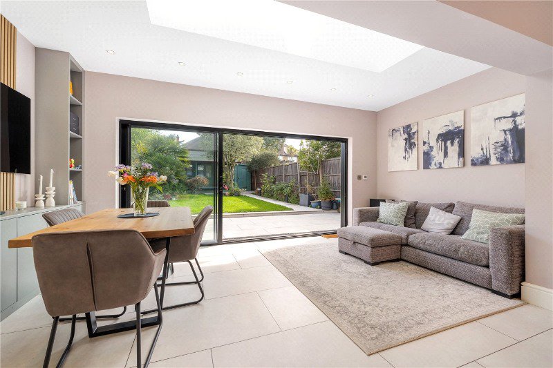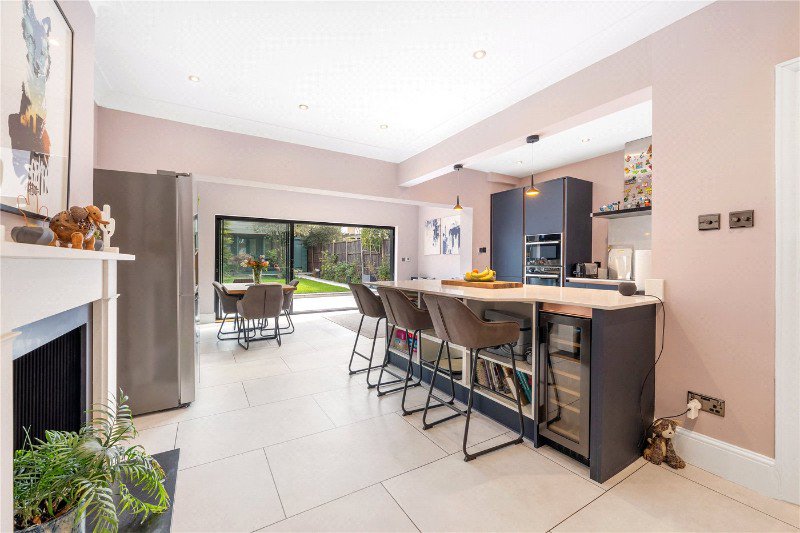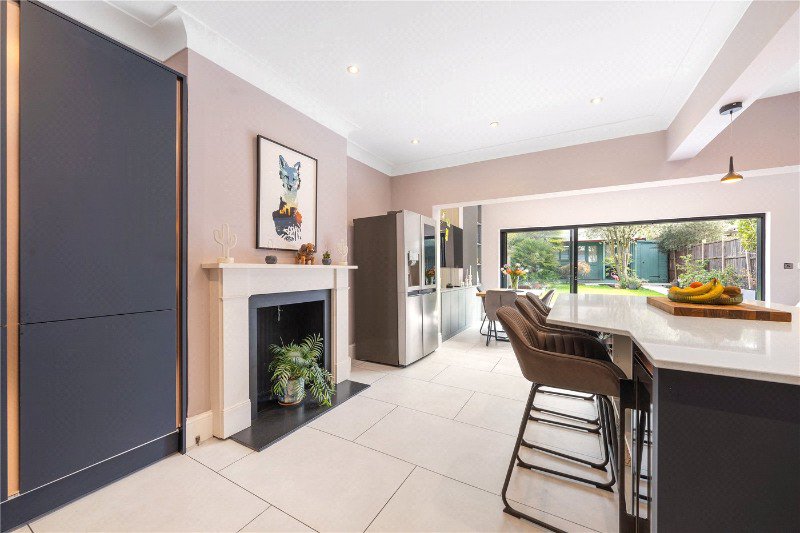 The ground floor has been thoughtfully reconfigured to create a bright and spacious flow. To the front, a welcoming reception room features a charming fireplace—perfect for cosy evenings. To the rear, the impressive open-plan kitchen/dining room forms the heart of the home, with ample space for entertaining and family life. Bi-folding doors open seamlessly onto a beautifully landscaped garden, creating a wonderful indoor-outdoor connection. At the far end of the garden, a substantial outbuilding provides an ideal home office, studio, or gym, offering excellent flexibility.