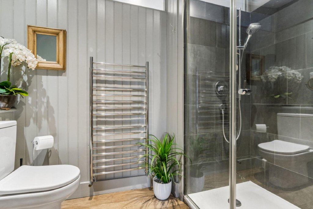 The kitchen/breakfast room, thoughtfully extended around 2013, is luxuriously appointed with multiple skylights and premium built-in appliances, offering both style and functionality. A conveniently positioned shower room completes the ground-floor accommodation.
