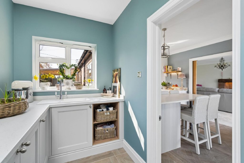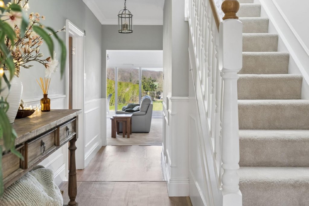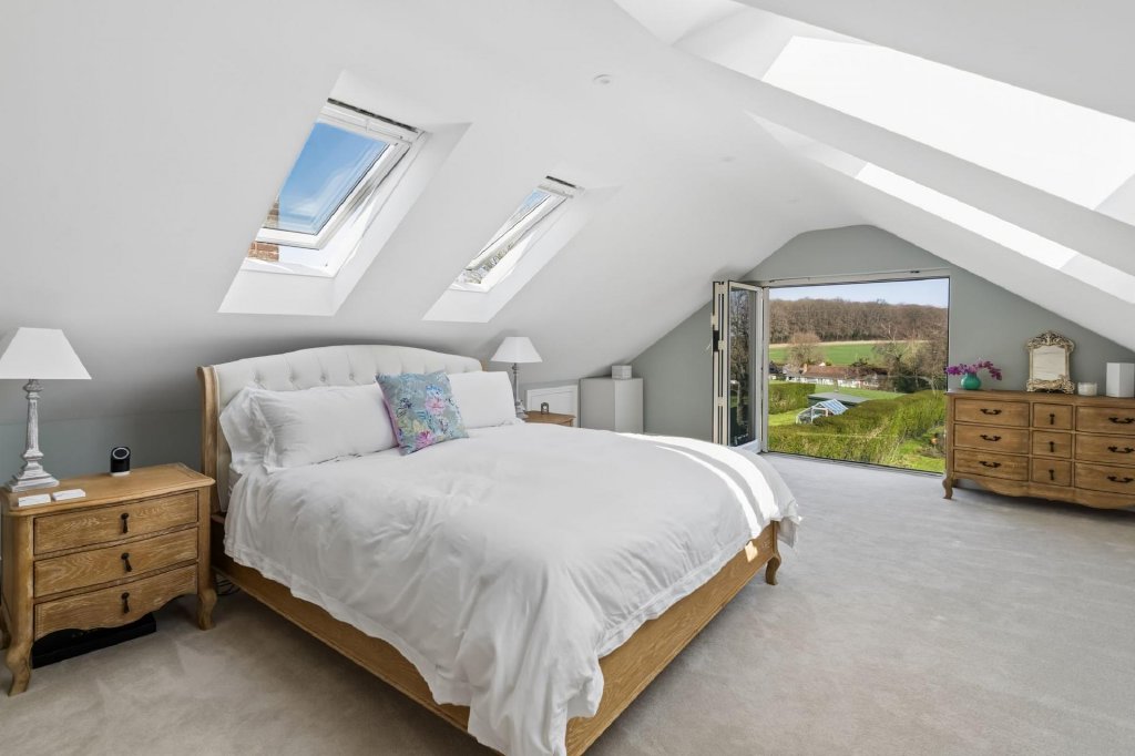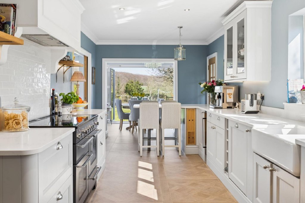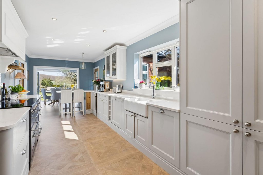 Designed to provide a high degree of flexibility, Beechwood is a fantastic home for everyday family life and entertaining which has been updated by the current owners to include modern conveniences such as air source heat pump, underfloor heating and new aluminium windows and doors to name a few. Accommodation comprises four double bedrooms which could be utilised as additional reception space if desired, serviced by a stylish shower room. The main living space is located to the rear, taking full advantage of the stunning views with a large sitting room with feature inglenook fireplace and bi-fold doors to the garden, dining room also with bi-fold doors to the garden, and well-appointed modern kitchen with separate utility room and pantry allowing ample storage. A cloakroom completes the ground floor accommodation. The principal suite occupies the entire first floor and is a luxurious space with Juliet balcony in the bedroom allowing views over open countryside and an ample walk in wardrobe and beautifully finished en-suite bathroom. Outside the garden is mainly to lawn with two decked areas for seating. The gated driveway offers ample parking with the benefit of a detached garage and carport with EV charger to the side of the property. St Leonards, set within the Chiltern Hills AONB, boasts a vibrant and active community with excellent accessibility to the surrounding countryside. Wendover Woods is a short distance away and offers a range of amenities including scenic walks, bridleways, a cafe, and childrens' playground. The market towns of Tring, Wendover, Berkhamsted, and Chesham are all within easy reach, offering a variety of shopping, dining, and leisure facilities. The area is also well served by highly regarded independent and state schools, with the advantage of access to the Bucks Grammar School system.